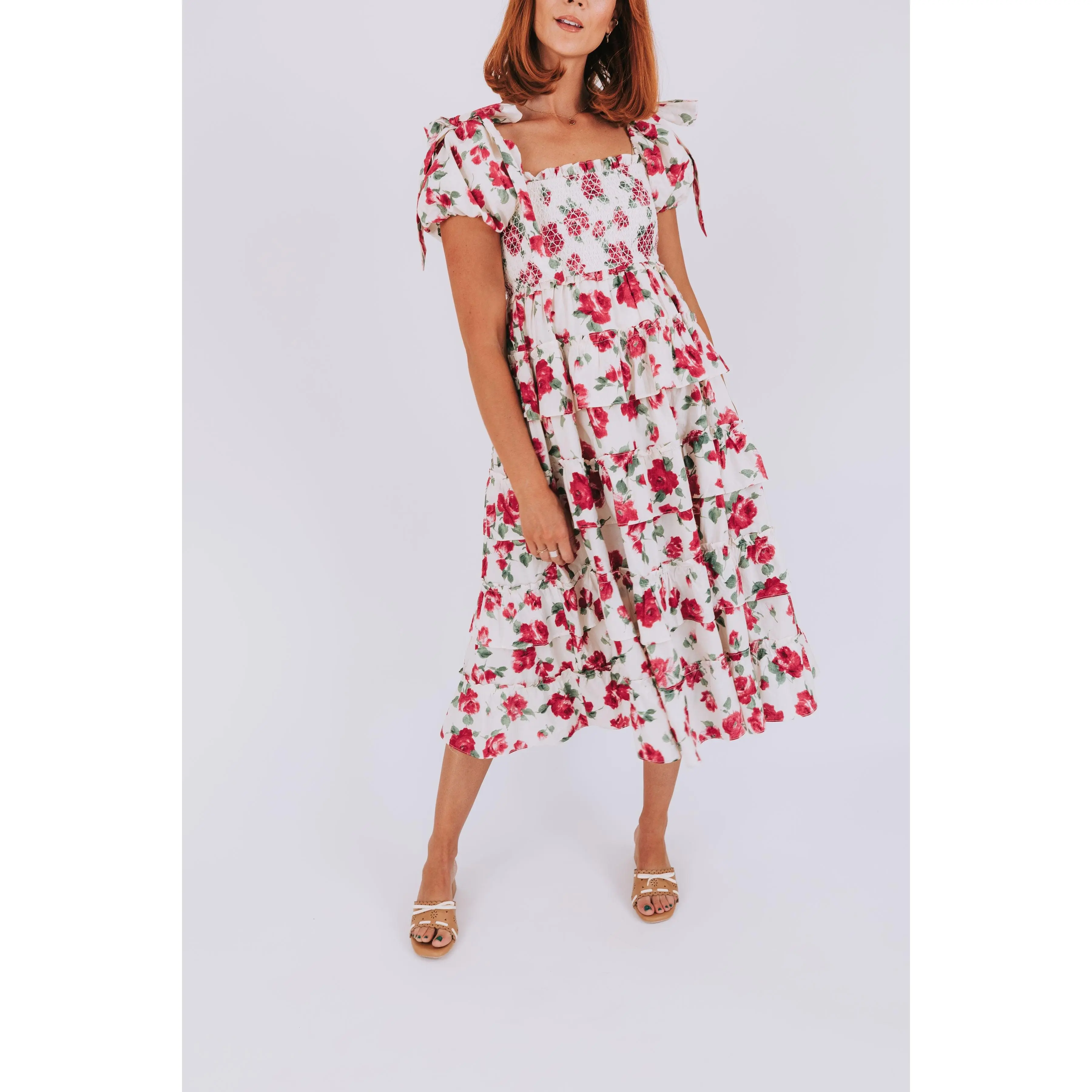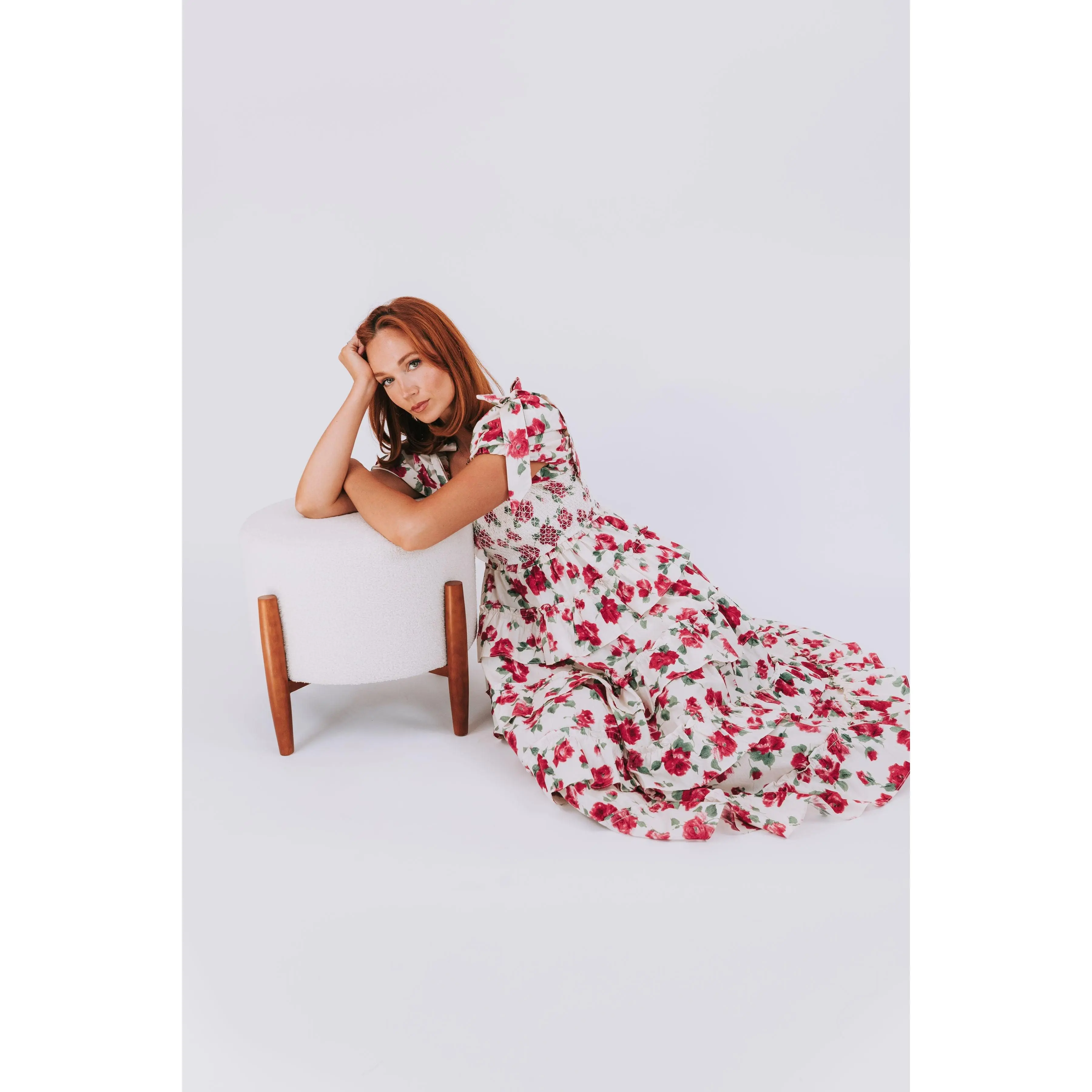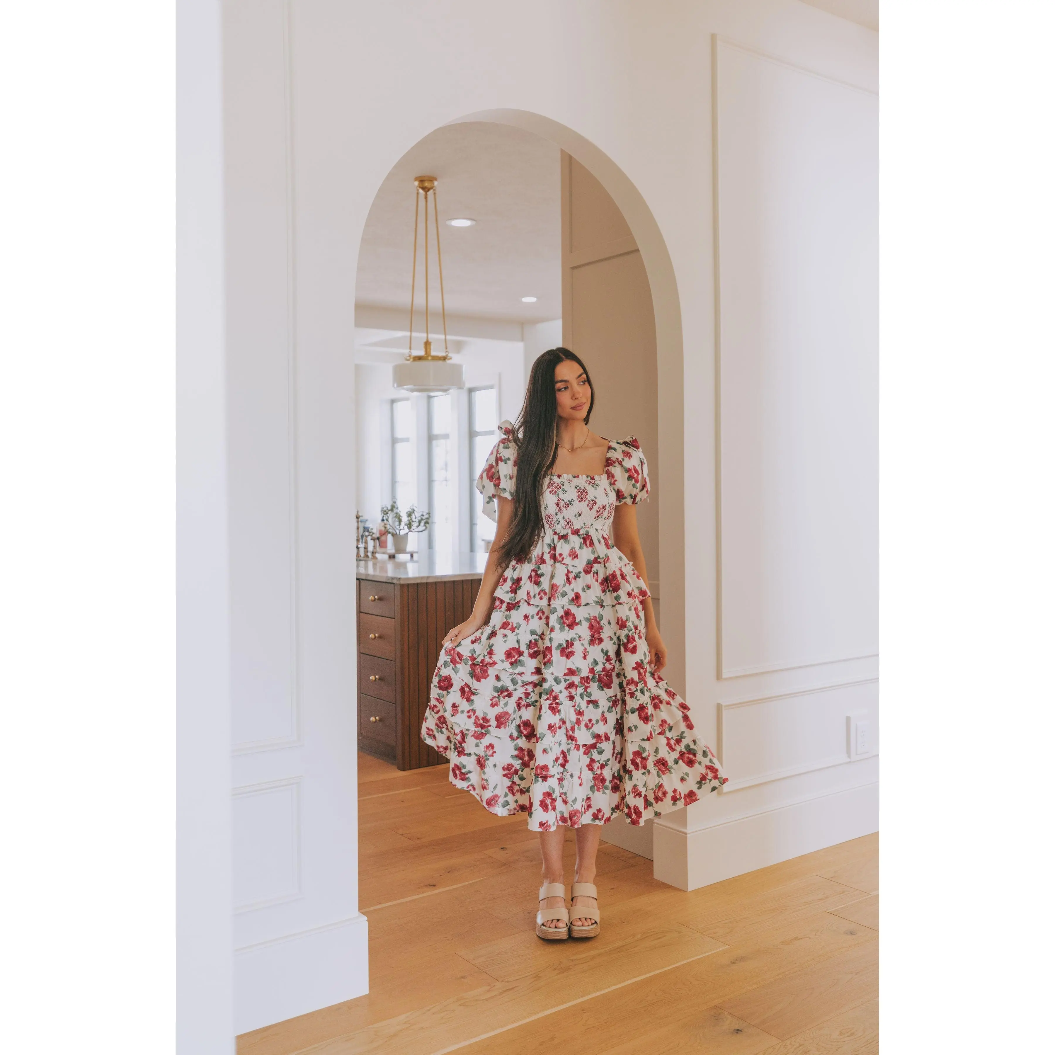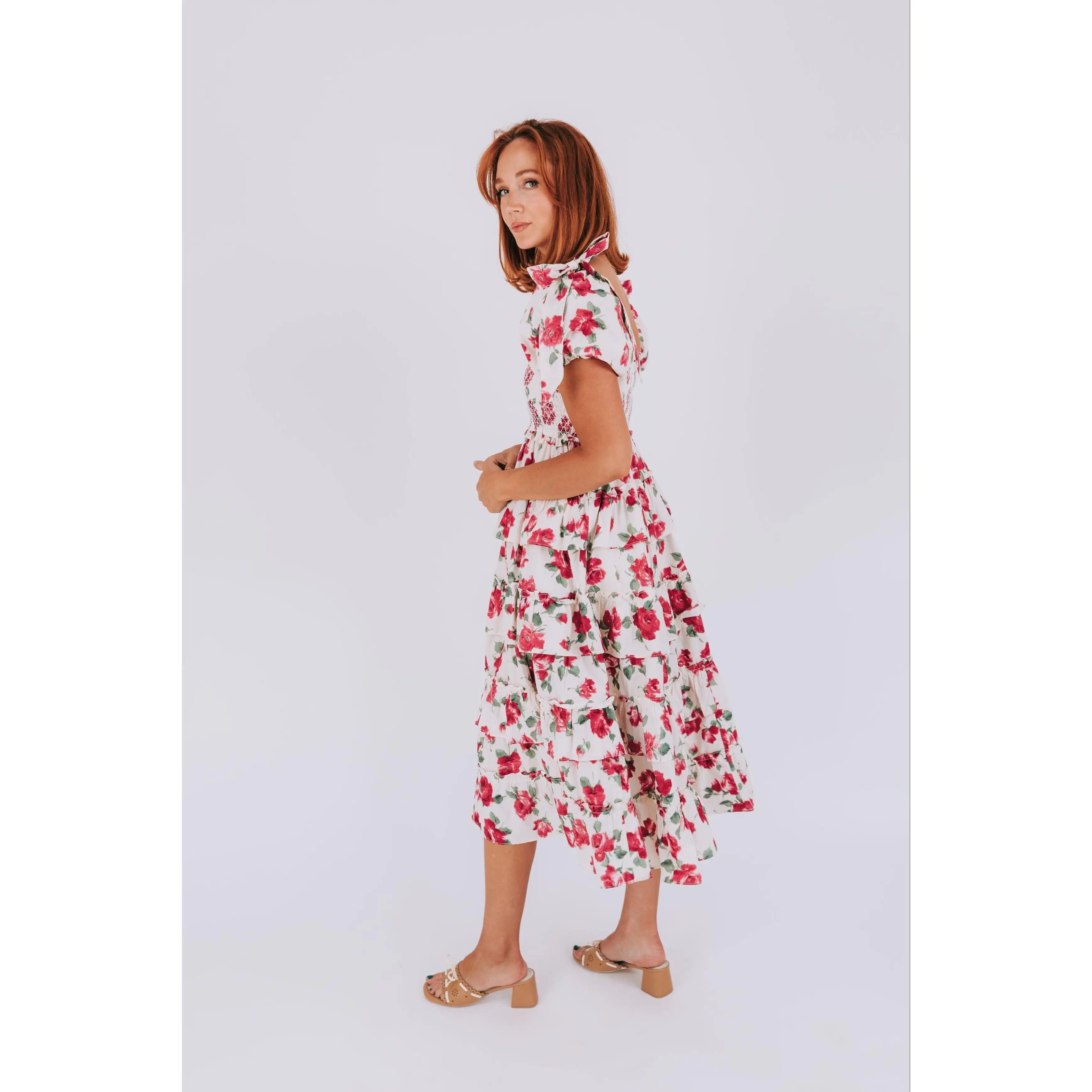 Get ready to turn heads in our EXCLUSIVE Wish I Knew Dress! This playful midi dress features a tiered skirt and a beautiful floral pattern in berry and green on an ivory base. The square neck with elastic in the shoulders adds a unique touch, while the bows on the shoulders add a touch of whimsy. The smocked bodice (with stretch!) and white stitching detail make this dress both comfortable and stylish. Don't miss out on this must-have dress!
