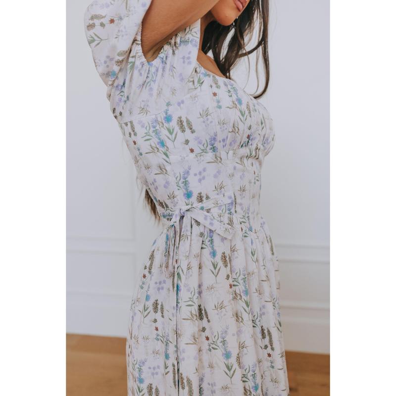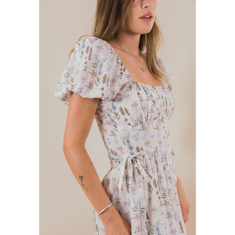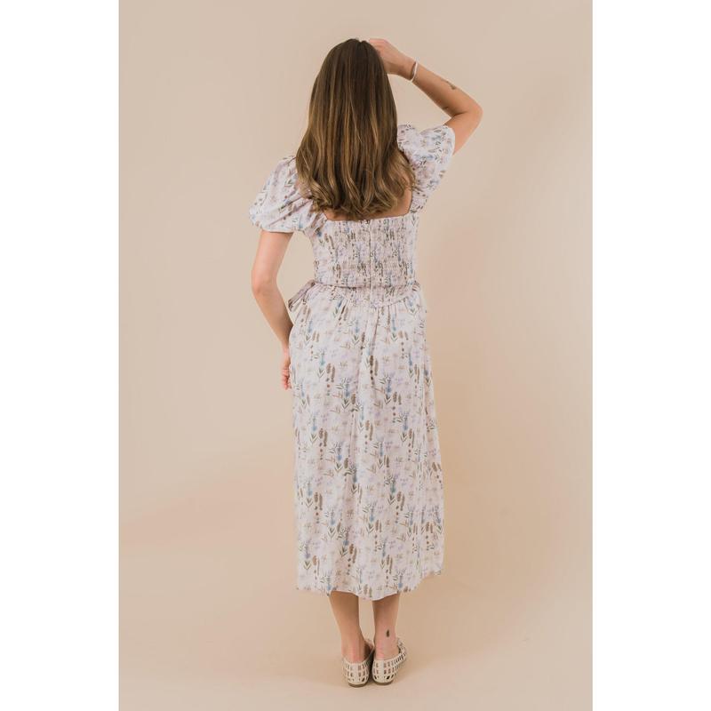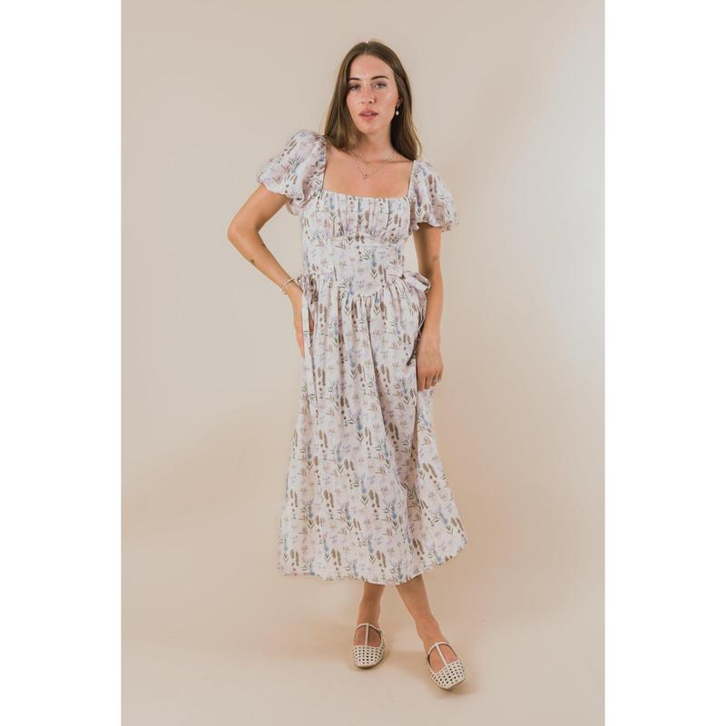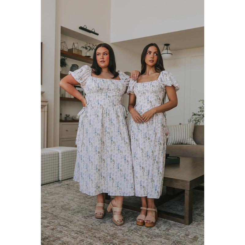 The EXCLUSIVE - Take Me To The Lakes Dress features a delicate floral print and charming short puff sleeves for a playful touch. The ruched bust and boning in the bodice create a flattering silhouette, while tied side bows at the waist add a sweet, whimsical detail. With its square neckline and flowing length, it’s perfect for twirling lakeside or any sunny day adventure.