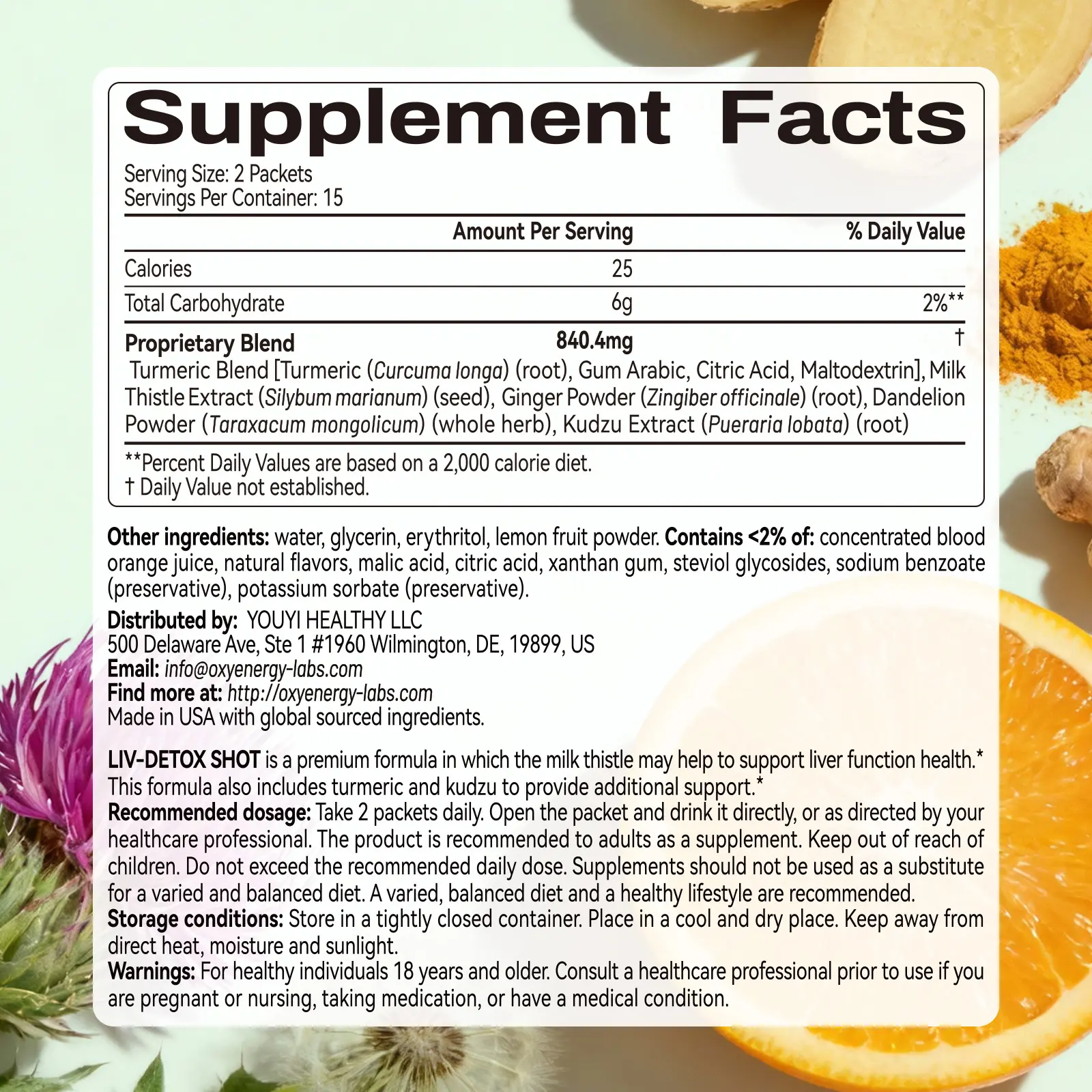 OXYENERGY LIVER-DETOX Shot is a premium dietary supplement designed to support normal liver function as part of a healthy lifestyle. It features a proprietary blend of plant-based ingredients, including turmeric, milk thistle, ginger, and dandelion, combined with a refreshing orange flavor.