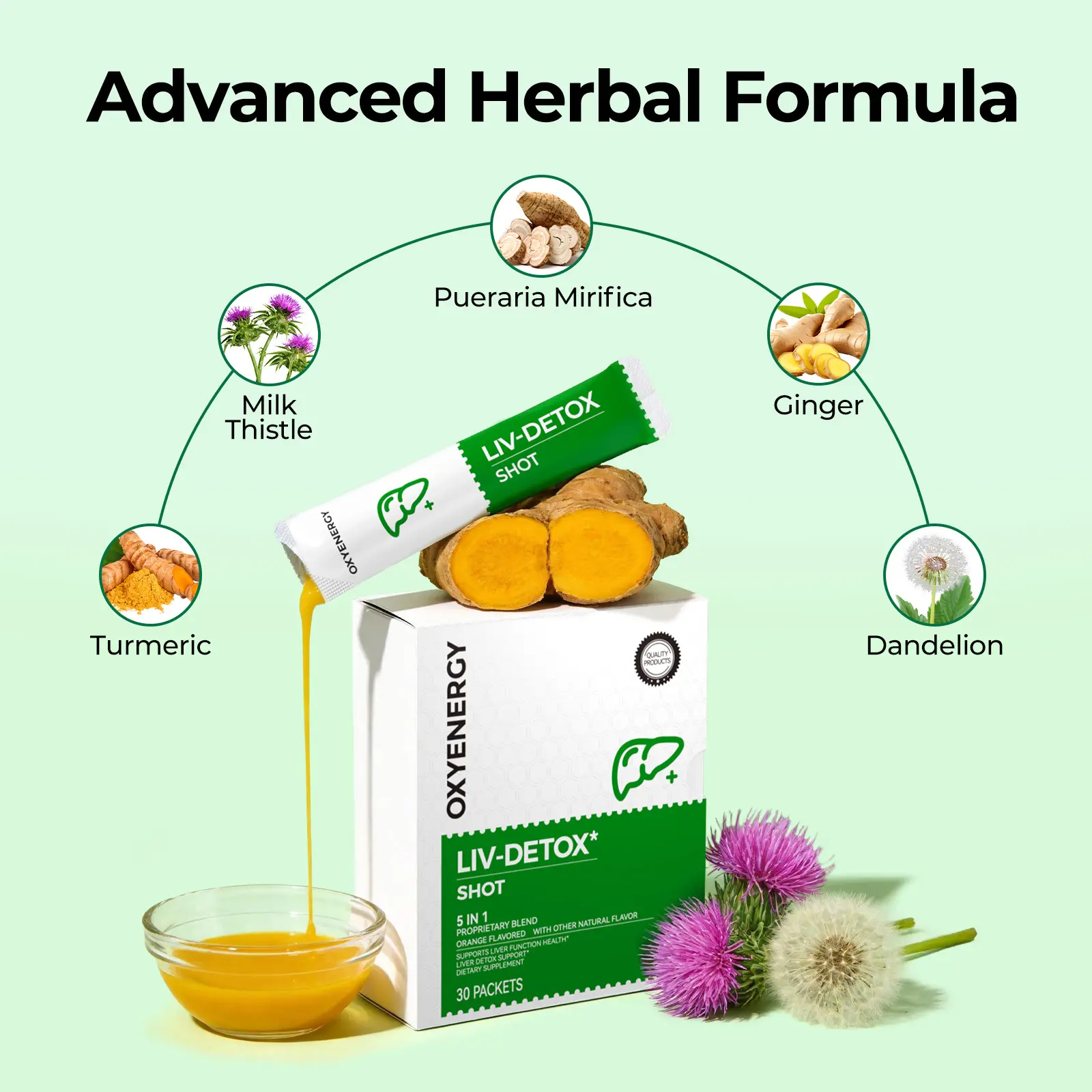 OXYENERGY LIVER-DETOX Shot is a premium dietary supplement designed to support normal liver function as part of a healthy lifestyle. It features a proprietary blend of plant-based ingredients, including turmeric, milk thistle, ginger, and dandelion, combined with a refreshing orange flavor.