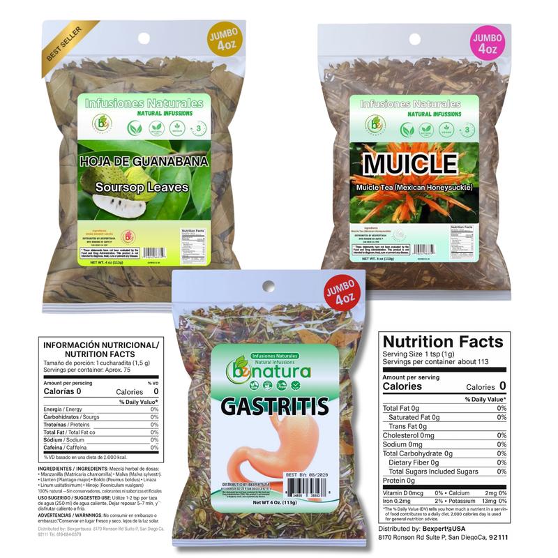 Discover the natural synergy of BexpertsUSA’s Muicle, Soursop & Gastritis-BYE Herbal Tea Combo a traditional Mexican herbal trio supporting digestive health, immune balance, and daily wellness.