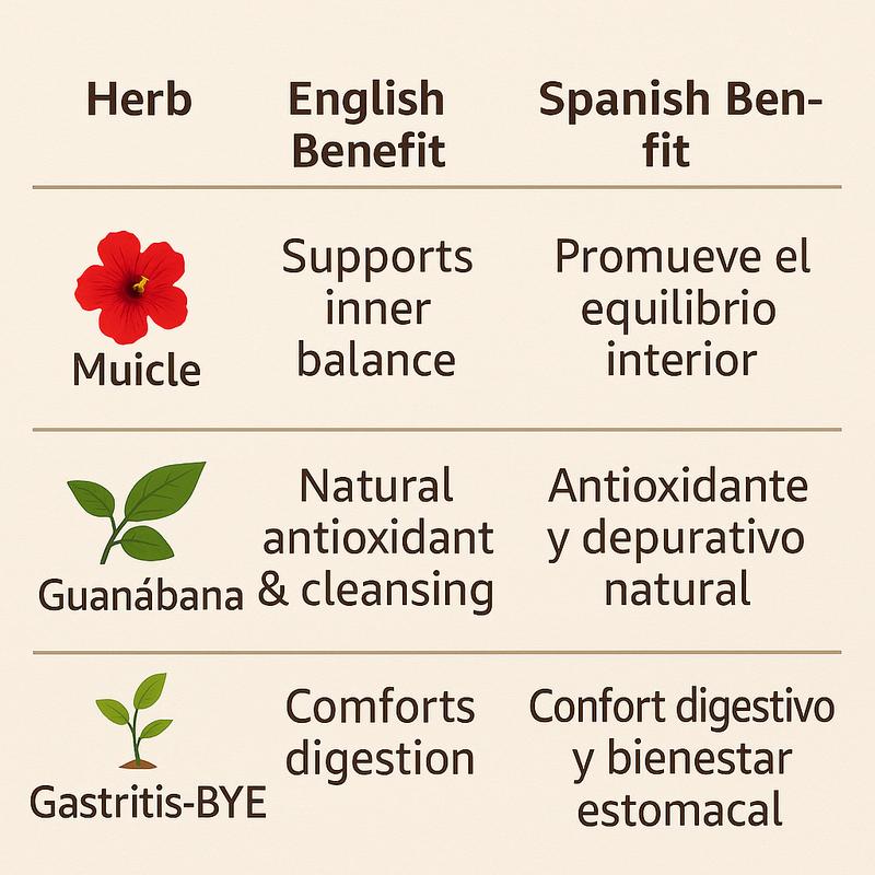 ·Cada infusión aporta beneficios únicos: Muicle para el bienestar, Guanábana para depurar, Gastritis-BYE para confort estomacal.