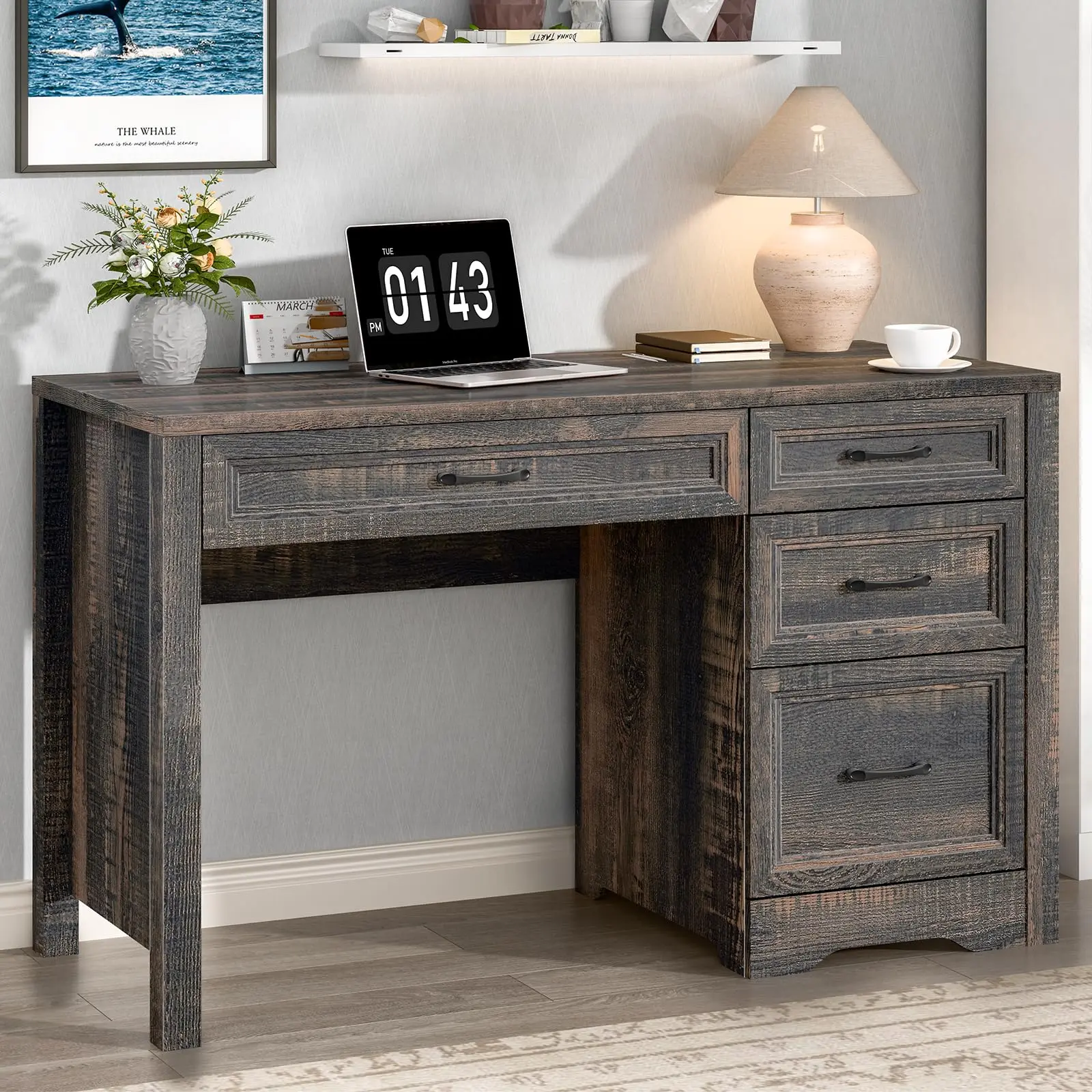 The wood grain design on the desktop reflects a strong farmhouse decoration style, showcasing rich natural styles and adding a natural atmosphere to your room. A smooth, polished, and waterproof desktop eliminates the hassle of cleaning and improves daily office efficiency.