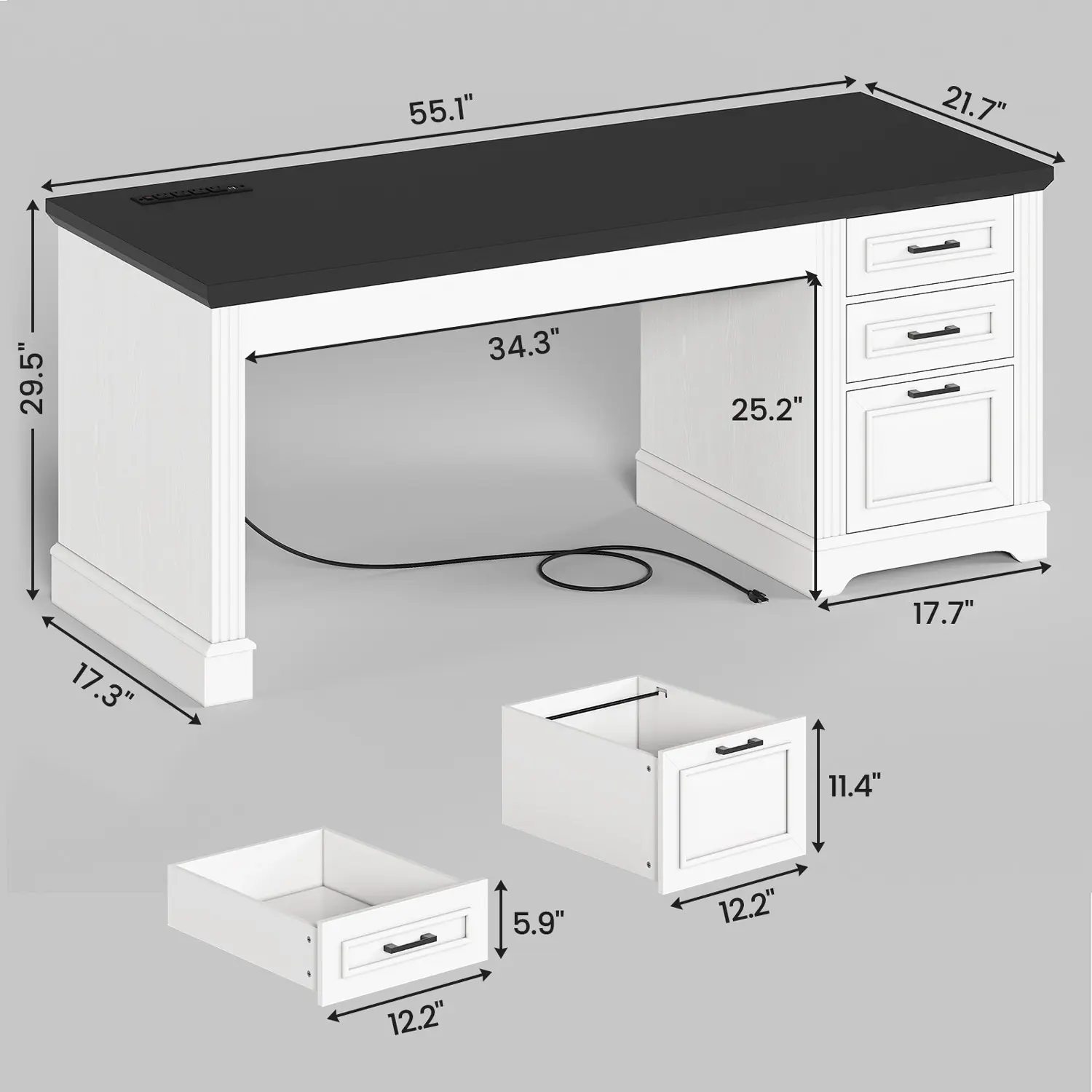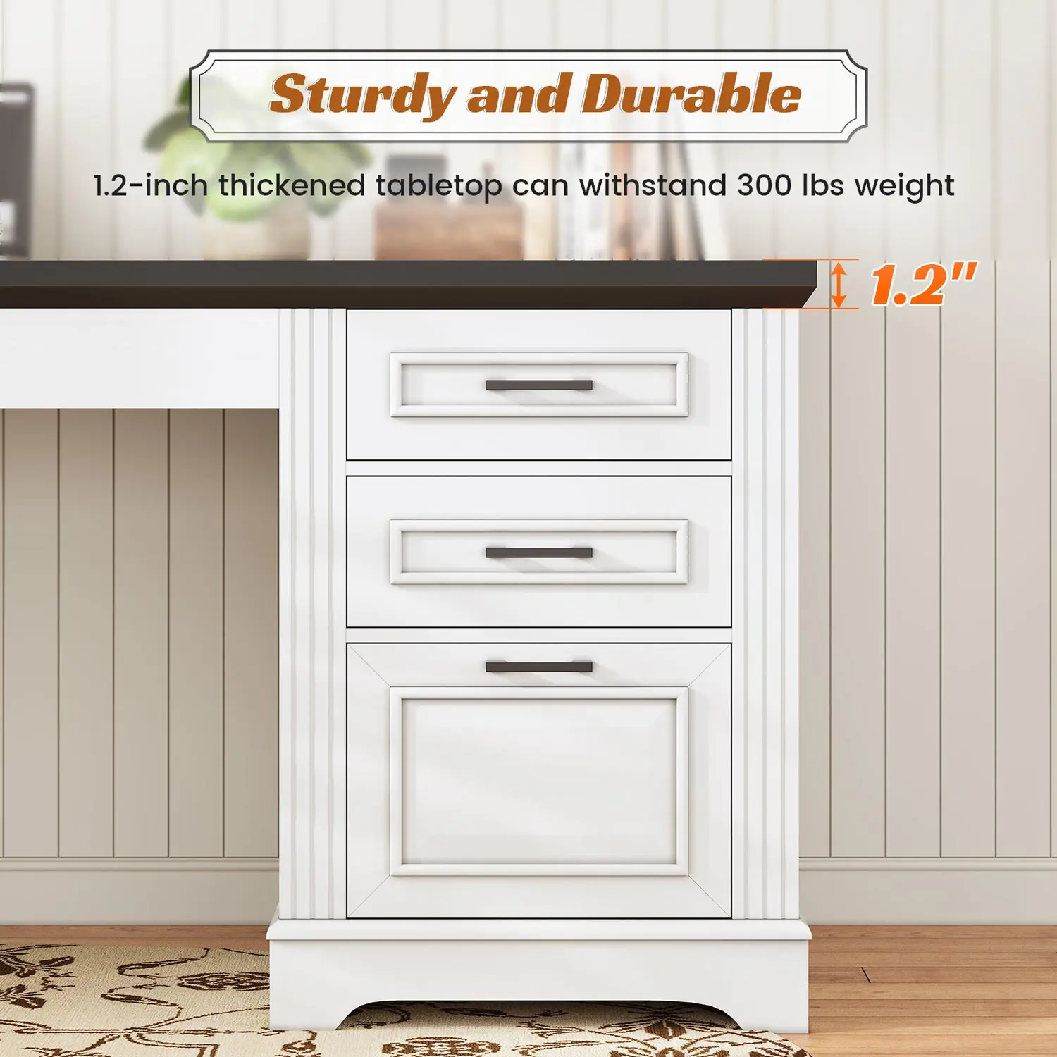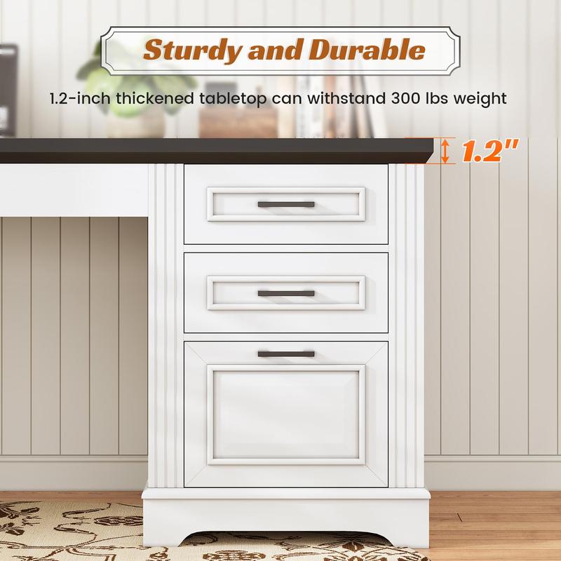 【Spacious space】This Executive office desk has a spacious desktop. The desktop size is 55"L*21.7"W. The computer table provides ample space for files, computers, printers. It features 3 drawers&storage cabinet which can accommodate a large number of files, books, and other office essentials. Three additional drawers feature metal runners and safety stops to keep you and your family safe