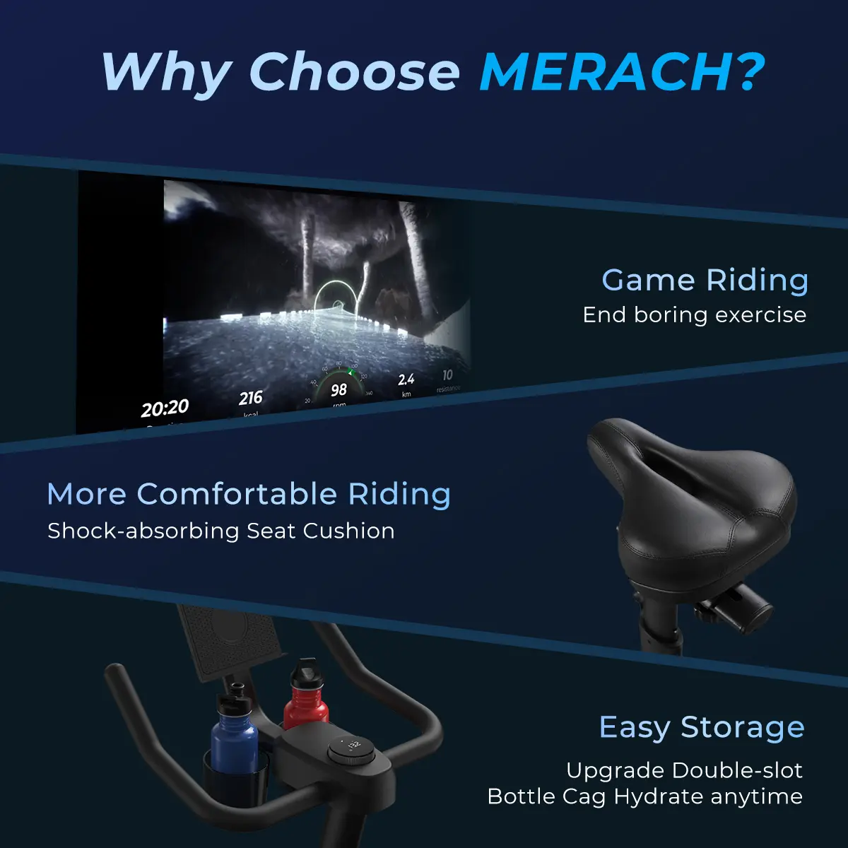 Game Riding increases the fun of exercise, and the upgraded spring seat cushion increases the shock absorption effect and reduces exercise pain. The double-slot water bottle holder can not only replenish water at any time, but store personal belongings.