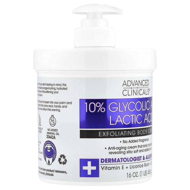Advanced Clinicals 10% Glycolic Acid, Lactic Acid, Exfoliating Body Cream, 16 oz (454 g)