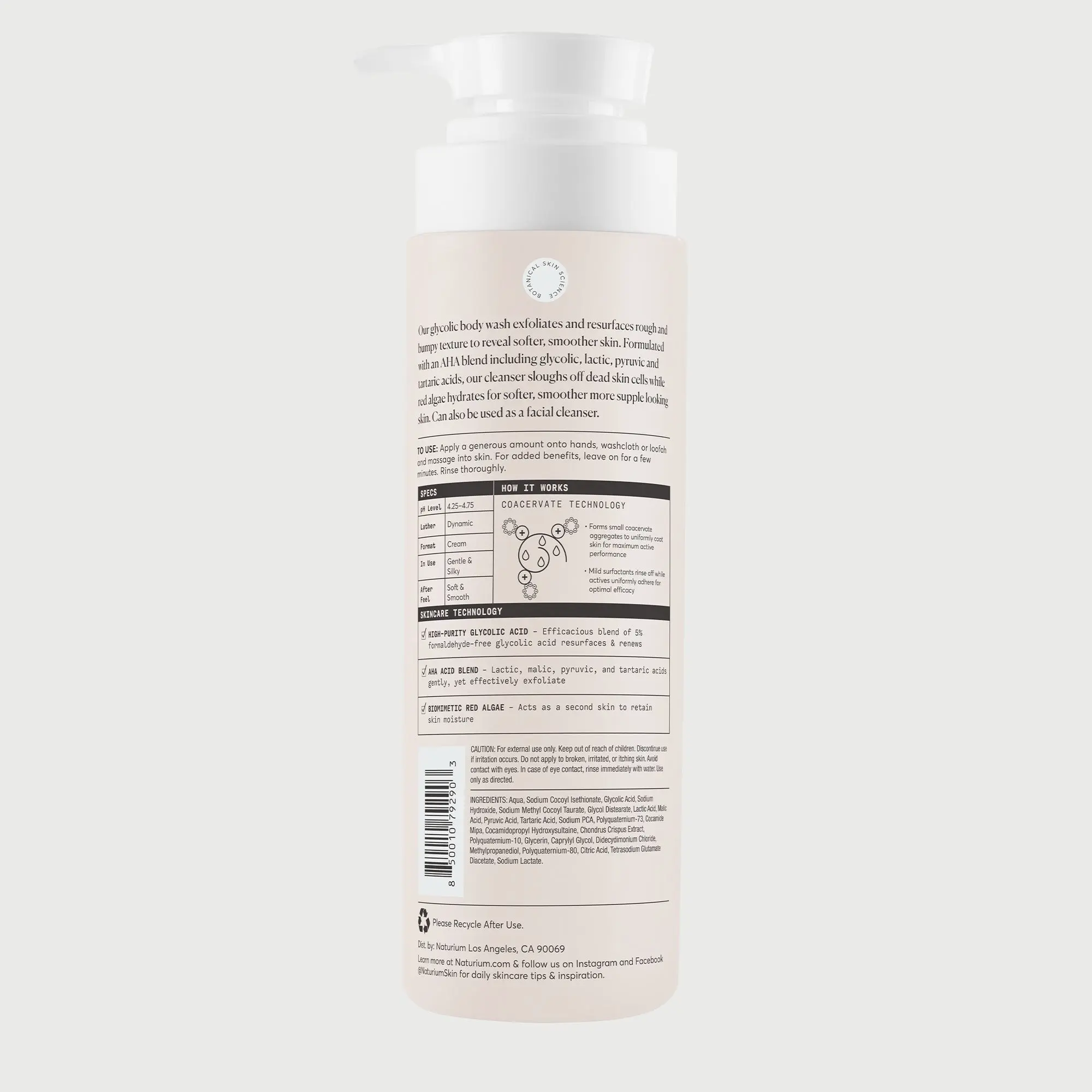 Our glycolic acid body wash exfoliates uneven and bumpy texture to reveal softer, smoother skin. Formulated with an AHA blend including glycolic, lactic, pyruvic and tartaric acids, our cleanser sloughs off dead skin cells, while red algae hydrates for softer, smoother more supple looking skin. Can also be used as a facial cleanser.