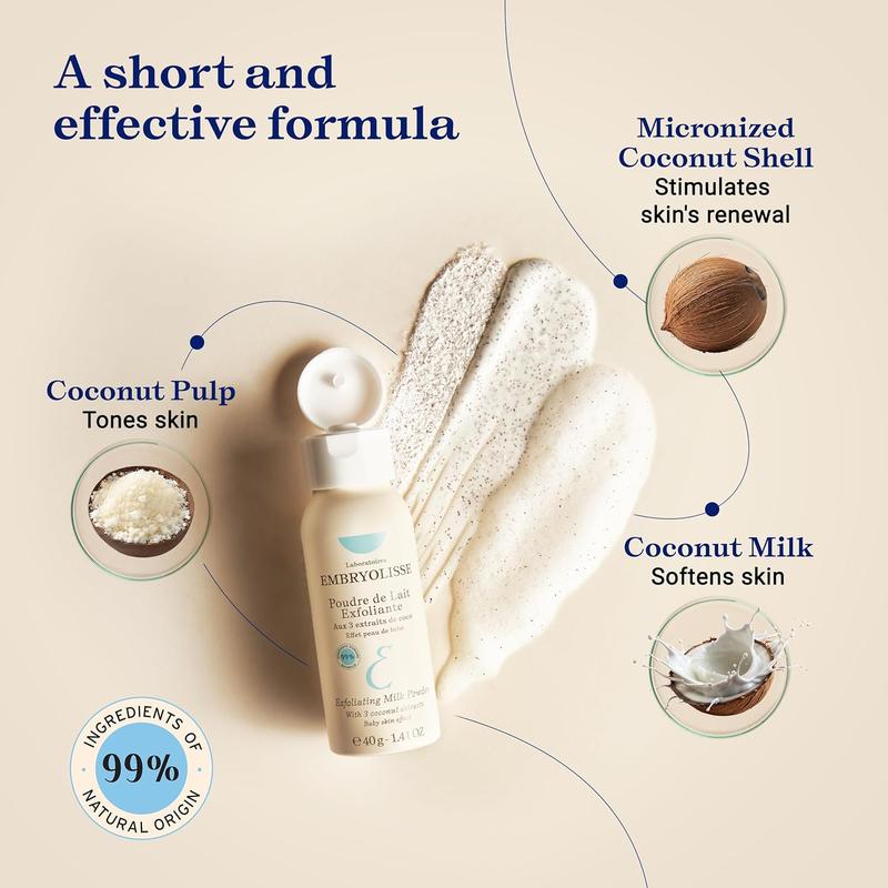 Embryolisse Exfoliating Milk Powder is your key to achieving baby-soft skin. This unique exfoliant combines the natural goodness of coconut in three forms: micronized coconut shell for gentle exfoliation, coconut pulp to tone the skin, and coconut milk powder for a smoothing effect.