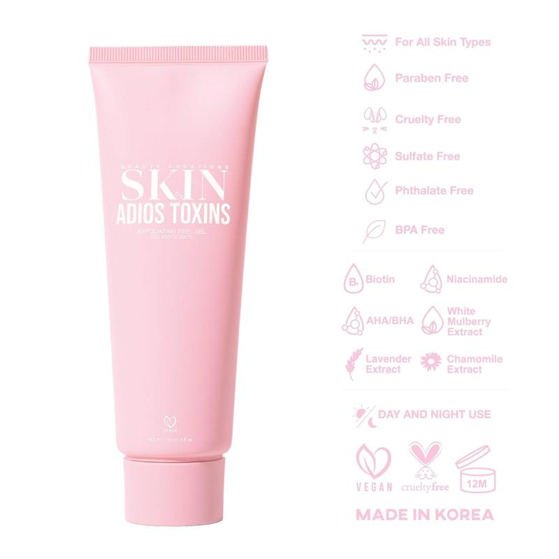 Adios Toxins Exfoliating Peel Gel: Say adios to toxins and stressed skin with our ADIOS TOXINS EXFOLIATING PEEL GEL. Composed with a mixture of fruit acids and extracts to exfoliate and remove dead skin cells while promoting a healthy surface. Packed with a high source of Vitamins to promote a bright, renewed and radiant skin.