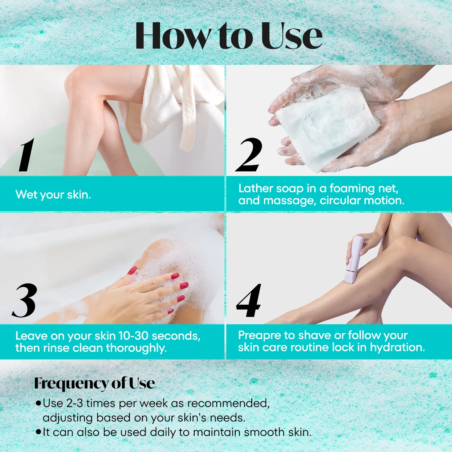 Take an appropriate amount of soap and use the included foaming net to create a rich lather.Apply evenly to the face and body, gently massaging to exfoliate, then rinse thoroughly with water.