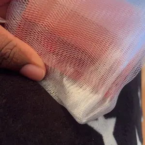 Material is soft. Easy to use, just drop you bar of soap into the bag, draw the string and it's ready to use