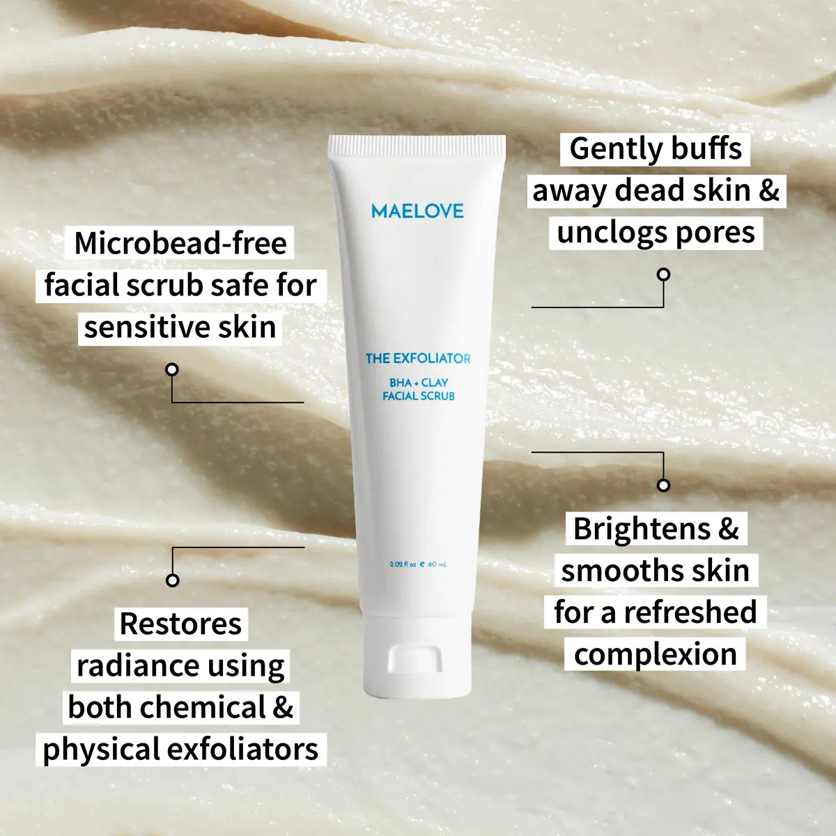 Safe for sensitive skin types, our microbead-free facial scrub is powered by salicylic acid (BHA), pulverized kaolin clay, and diatomaceous earth. Together, these ingredients gently draw out impurities, absorb excess sebum, and unclog pores.