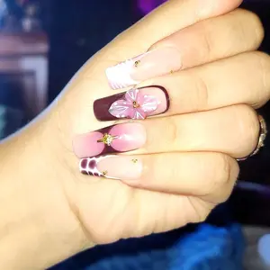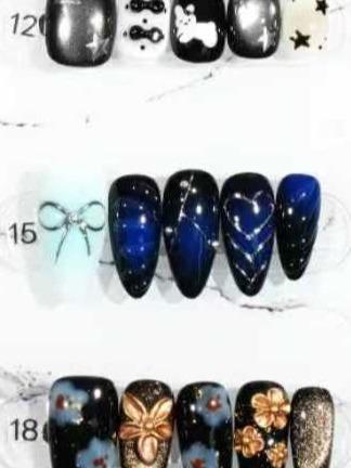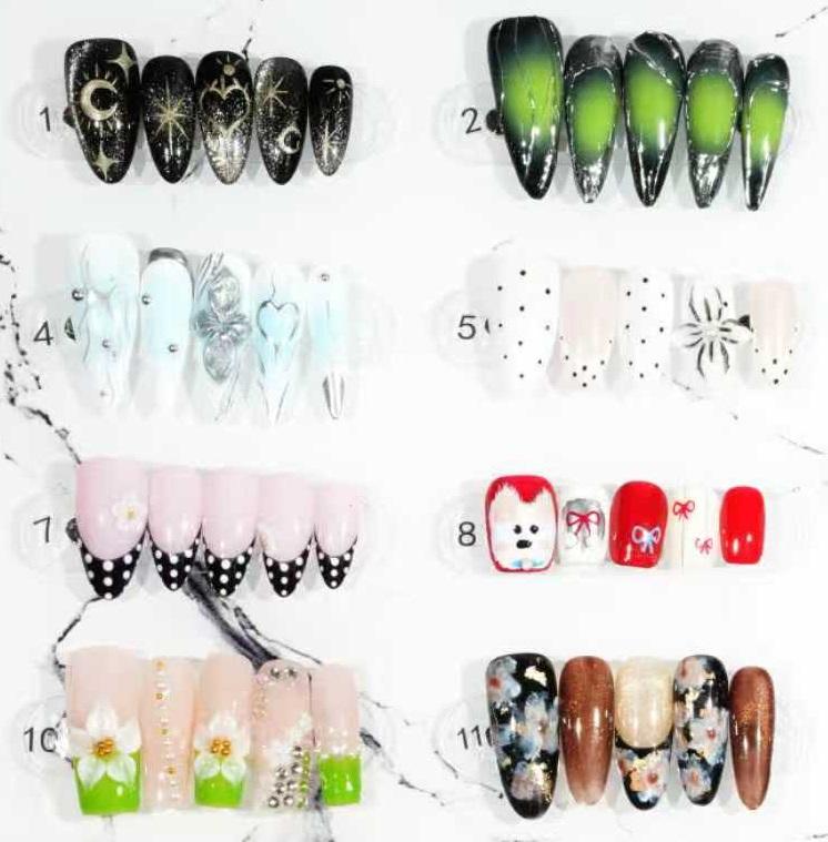 This nail art display showcases 24 styles with diverse aesthetics, each featuring unique designs. The standout No.18 design captivates with its vibrant painted floral patterns, complemented by intricate metal-embossed details that add a touch of sophistication and depth. The collection spans minimalist monochromatic designs to intricate patterns, from whimsical cartoon motifs to contemporary geometric shapes. Every piece caters to individual preferences, offering perfect options for both everyday wear and special occasions.The complimentary four-piece set contains jelly glue for DIY projects.