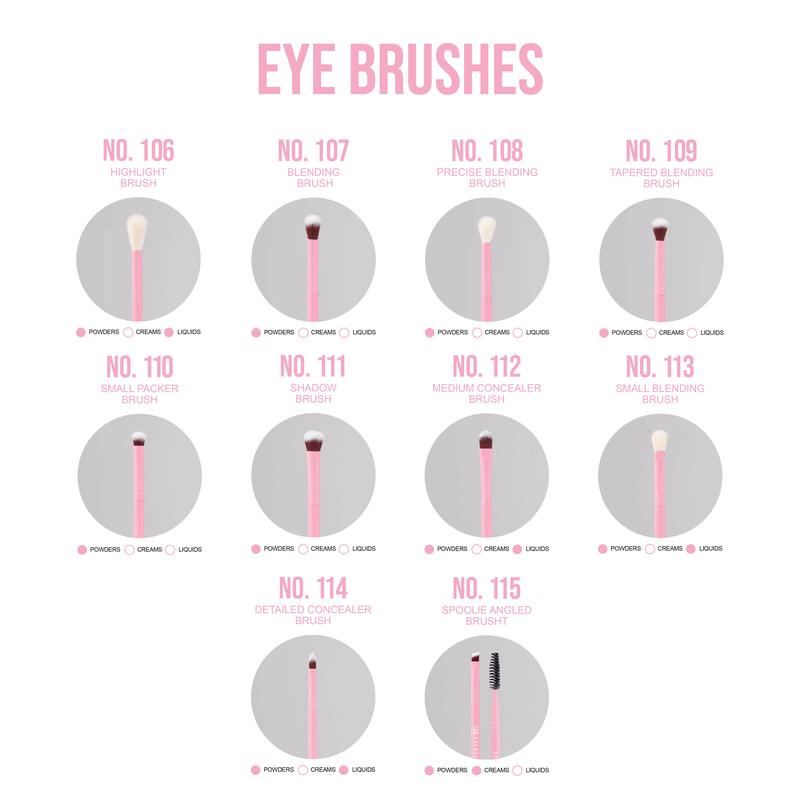 NO. 101- LARGE ROUND POWDER BRUSH NO. 102- ANGLED CONTOUR BRUSH NO. 103- ANGLED BLUSH BRUSH NO. 104- MEDIUM DETAILED ROUND BRUSH NO. 105- ANGLED DETAIL BRUSH NO. 106- HIGHLIGHT BRUSH NO. 107- BLENDING BRUSH NO. 108- PRECISE BLENDING BRUSH NO. 109- TAPERED BLENDING BRUSH NO. 110- SMALL PACKER BRUSH NO. 111- SHADOW BRUSH NO. 112- MEDIUM CONCEALER BRUSH NO. 113- SMALL BLENDING BRUSH NO. 114- DETAILED CONCEALER BRUSH NO. 115- SPOOLIE ANGLED BRUSH
