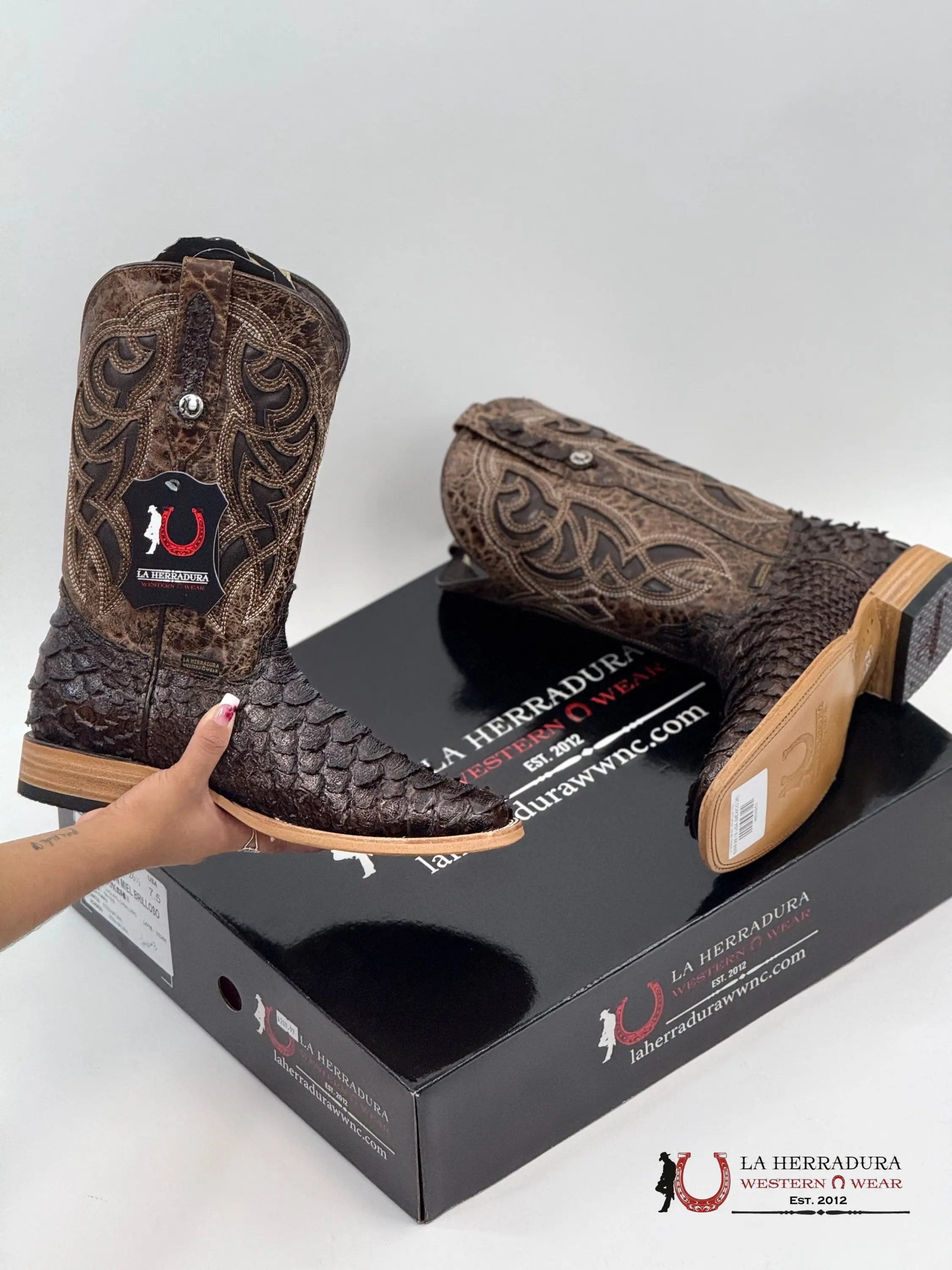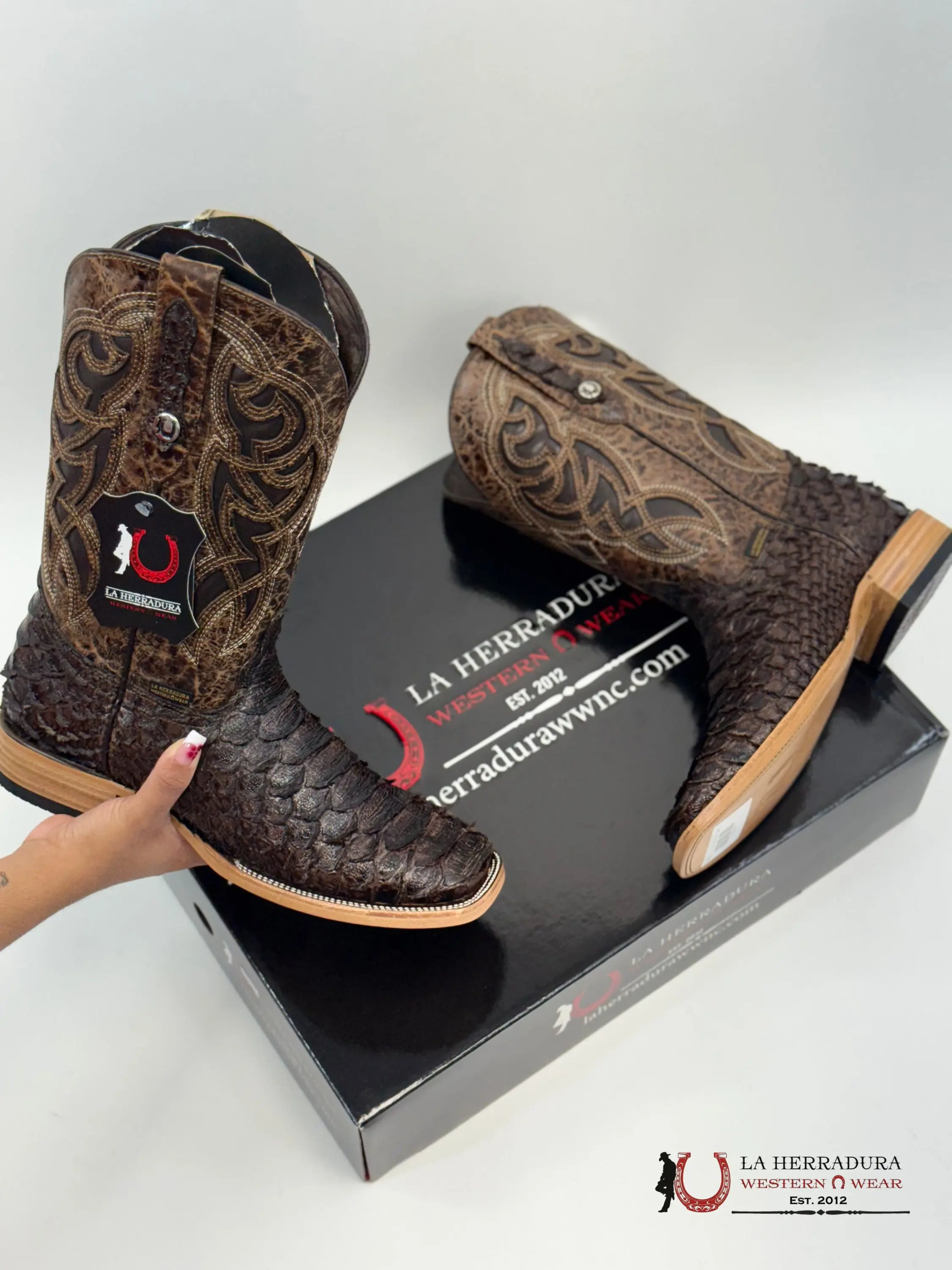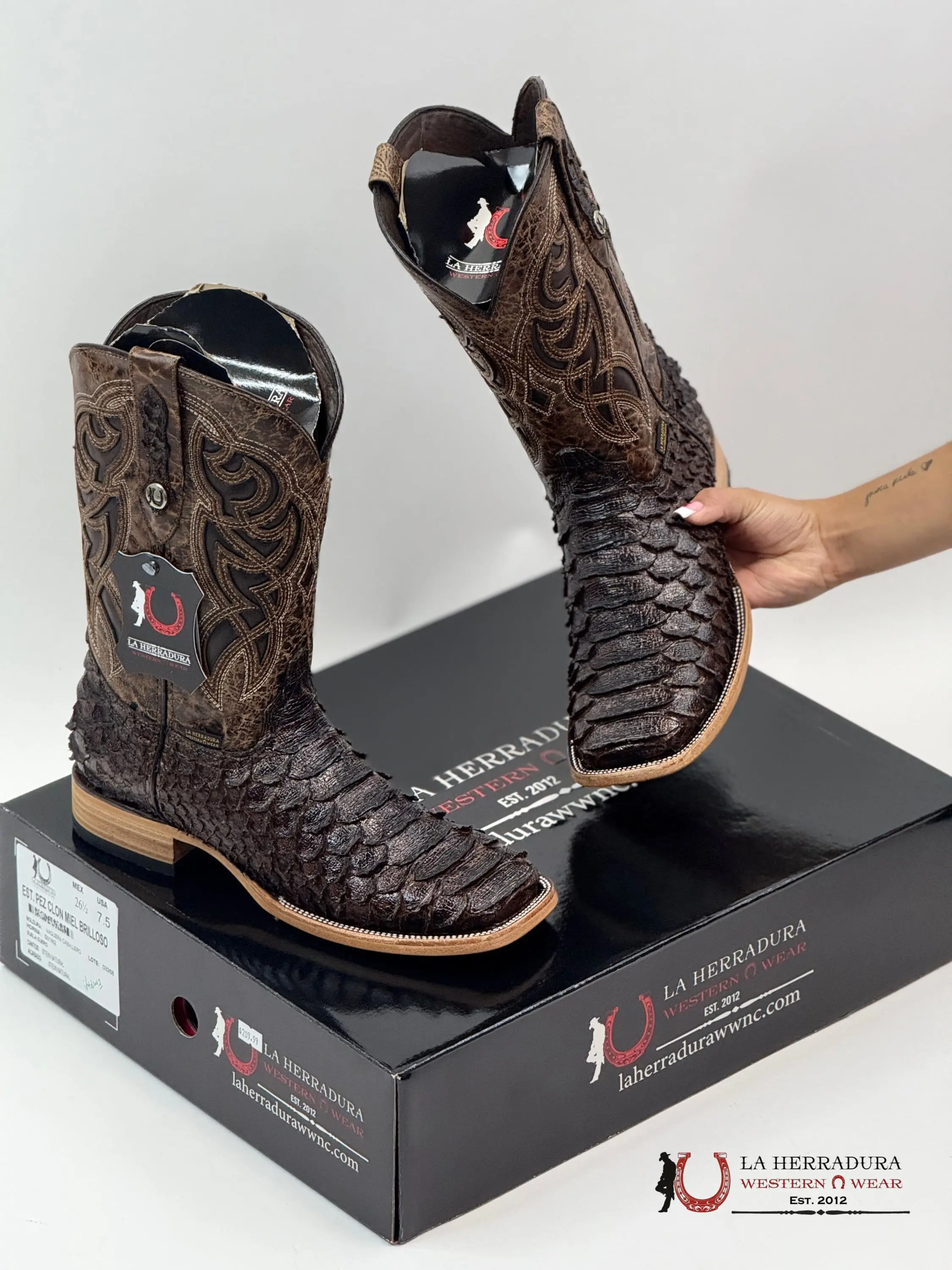 Step into unmatched style with the LA HERRADURA EST. PITON CLON MEGA CAFE BRILLOSO boot. This exotic western boot combines elegant design with superior comfort, featuring rich, glossy python-inspired leather in a deep coffee tone. Perfect for those who seek a bold yet refined look, it offers both durability and a standout presence for any occasion. Elevate your wardrobe with this stylish and comfy statement piece.