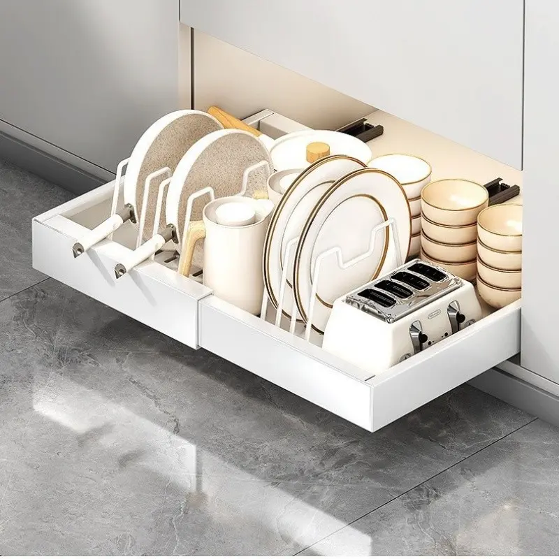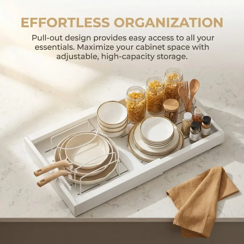 Telescopic cabinet basket - drawer style storage, doubling cabinet space utilization