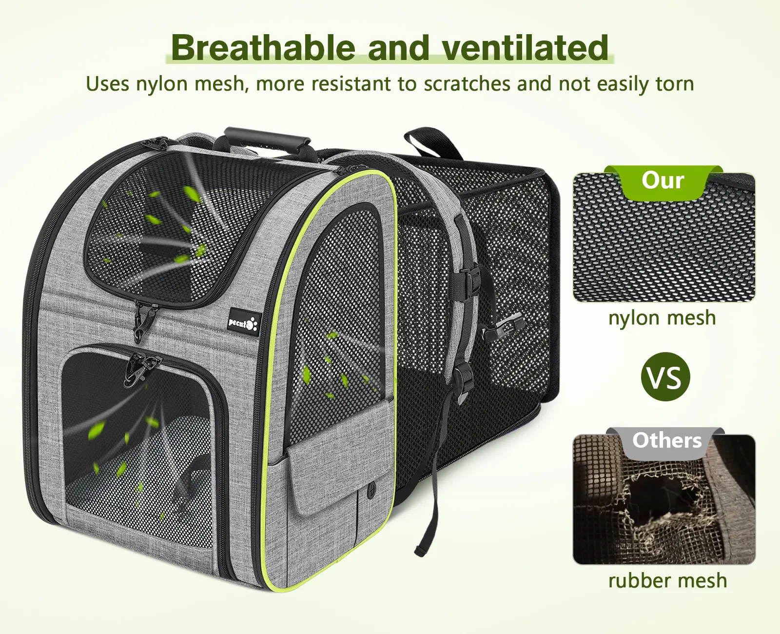 First the design looks great. It is very light weight. The inside is soft and my cats love it already. Now I can use this for trips to the vet or just for a walk outside.