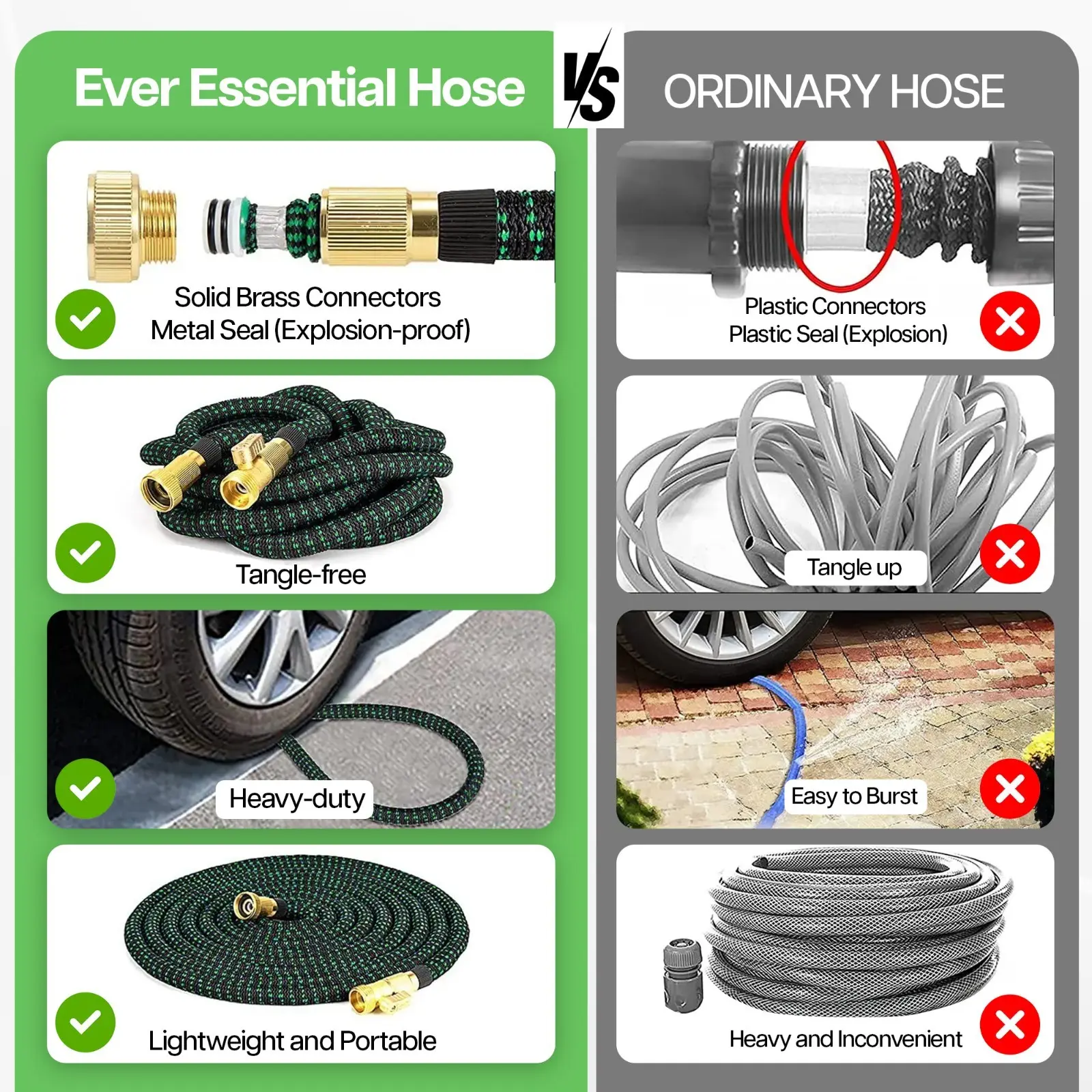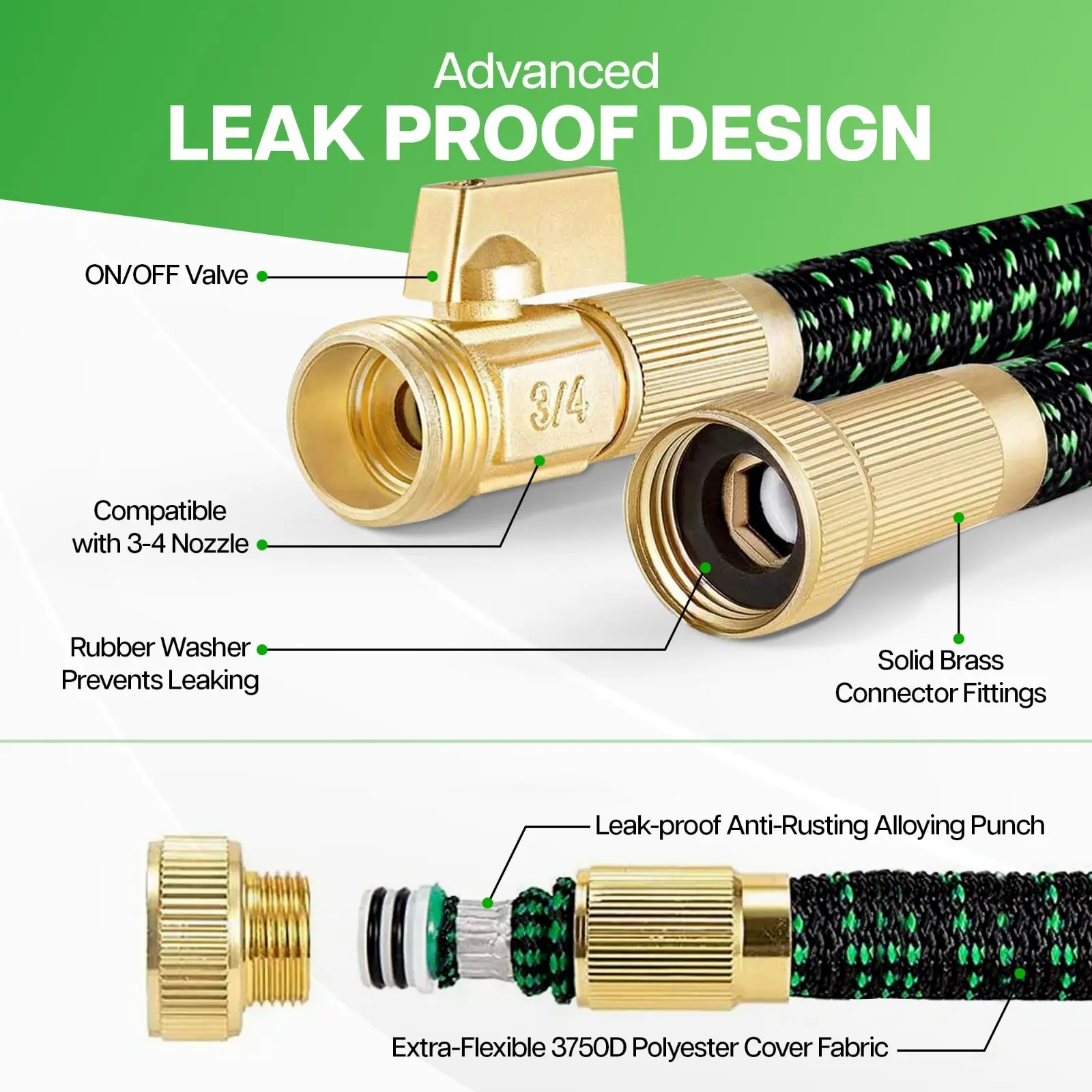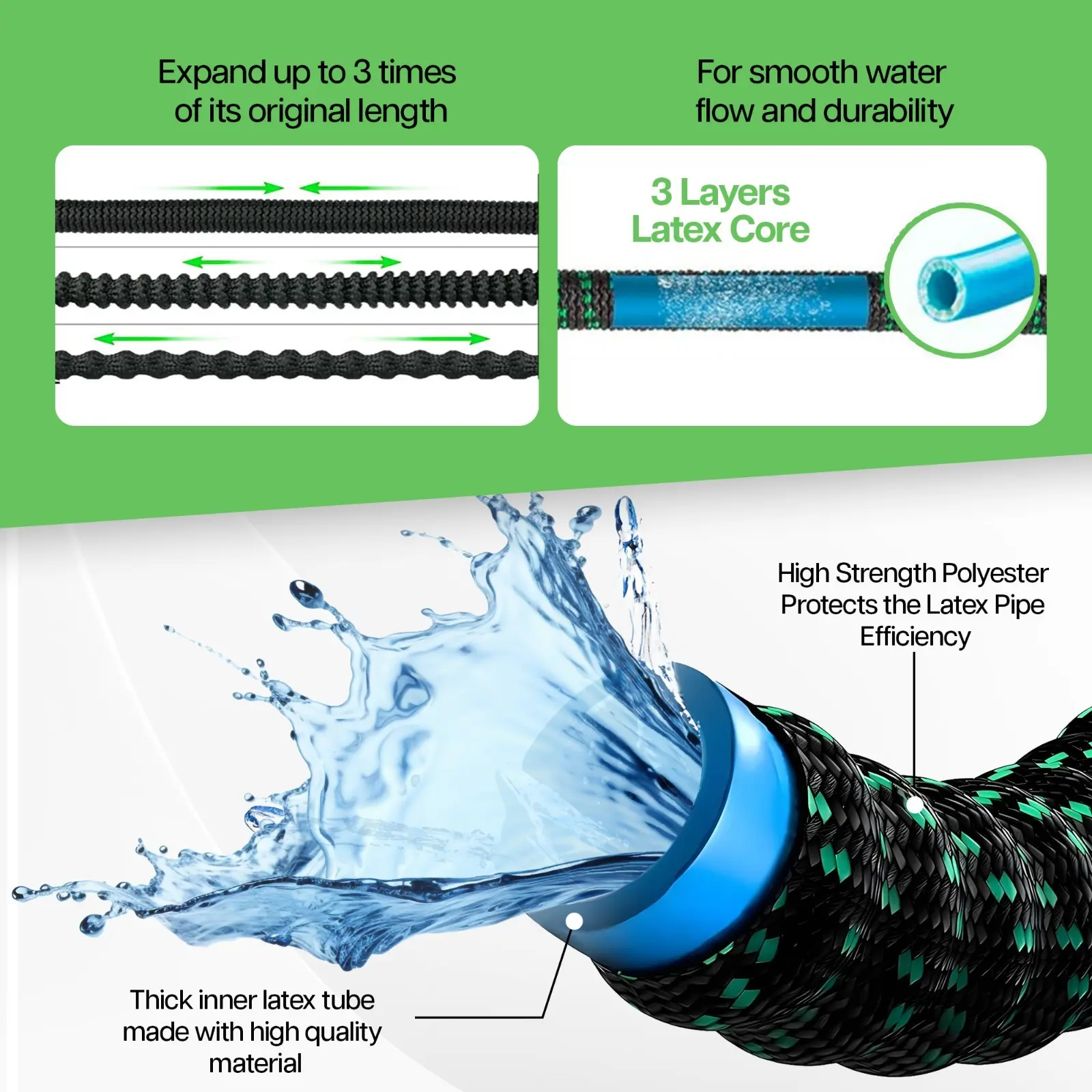 - Material:The inner layer is made of latex material, and the outer layer is a high-elastic fiber braided layer (2500D latex imitation braided process), which provides wear resistance and tensile protection, enhancing the durability of the hose