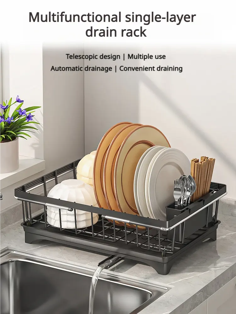 This Expandable Kitchen Sink Drying Rack with Auto Drain is perfect for your countertop. It's an adjustable dish rack that saves space. Use it as a utensil & plate organizer. The multi-purpose drying rack is ideal for dishes, fruits, and kitchenware.