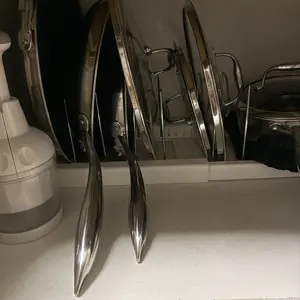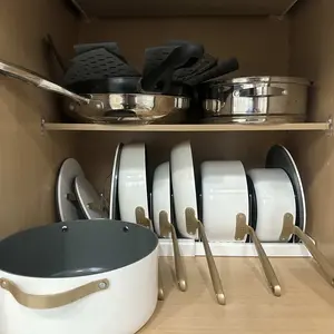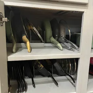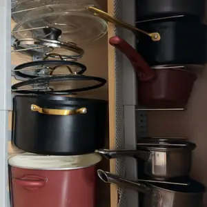 ·WIDELY USED: This versatile pot and pan organizer for under cabinet can store heavy-duty pots, cast iron pans, lids, dishes, cutting boards and bakeware. It saves a lot of space in cabinets, drawers or countertops and keeps your kitchen tidy and beautiful.