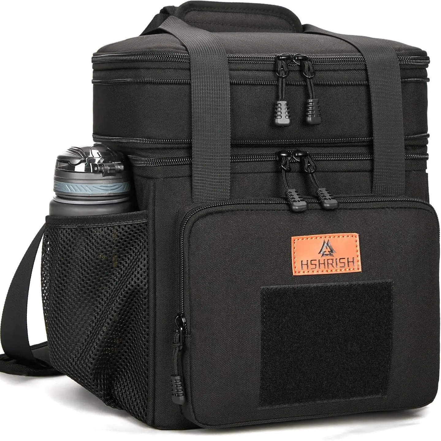 This durable insulated lunch bag is perfect for adults. It features a shoulder strap for easy carrying. The bag is designed as a soft cooler bag, suitable for men. It's ideal for work, outdoor picnics, and trips.