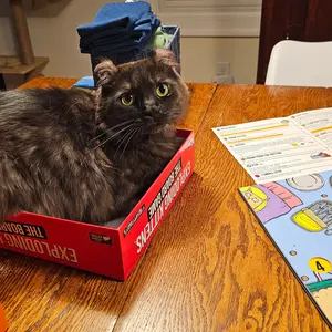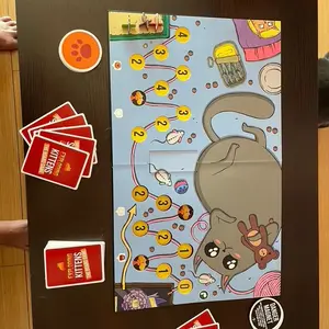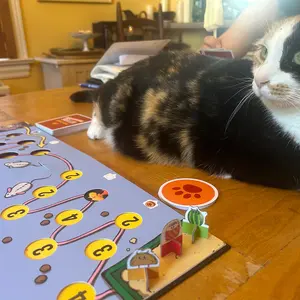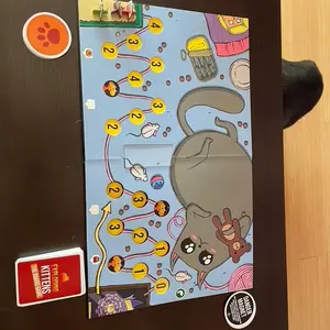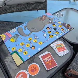 Setup and rule dissertation went smoothly. The instructional video QR code didn't give us one, but since it's pre launch that probably doesn't weigh on things. Once we shuffled them better than I did, the variety of cards made for a very good time. Both of my volunteer co-players professed they would've liked to see more cards, but the variety art and flavour texts were a hit. We enjoyed the board flip mechanic, more after one player was told it wasn't a full 'get this out of here' flip. The danger magnet discs were a cool way to inject danger and outright malice for our competitors. We managed two games within 45 minutes, so(checked after playing) we hit the suggested game length. One player opined it would be interesting to have a longer game. If the board couldn't be enlarged somehow, perhaps a secondary play rule of 'winning means going to the ribbon and back'; to hardwire that in would require an arrow by the litter box similar to the ribbonsl's arrow to keep the exact roll requirement(but it would also just be imagined). The pieces were easy to assemble, and the board flip mechanic and magnets performed quite well. We did find some issues with player tokens near the board fold during a flip. Maybe if those holes were slightly more oval along the horizontal? All in all, we quite enjoyed our time with this, and it will enter regular game rotation!