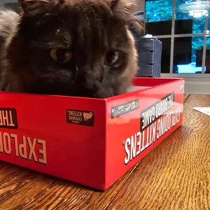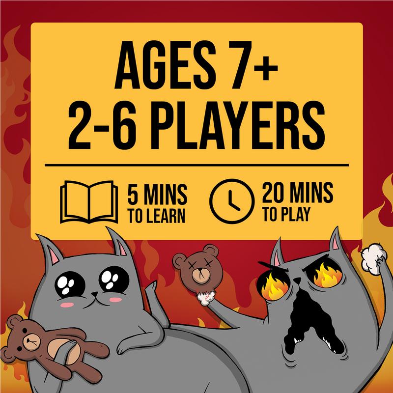 Our family highly anticipated playing the board game version of Exploding Kittens, we were not disappointed. The board is cleverly made, with illustrations that change when you flip the board making the kitty and surroundings change from playful to devilish. Players choose gamepieces that are familiar characters from Exploding Kittens, such as Rainbow Ralphing Cat and Potato Cat, along with some new cats like Garden Gnome cat. The game took around 20-35 mins with 5 people, which is a good amount of time to play multiple rounds. With three people it went a bit faster, about 15 mins, with one lucky player sweeping. Some players wished the game lasted a little longer. Also, we'd love an expansion to add a greater variety of cards or more players than the 6 maximum.