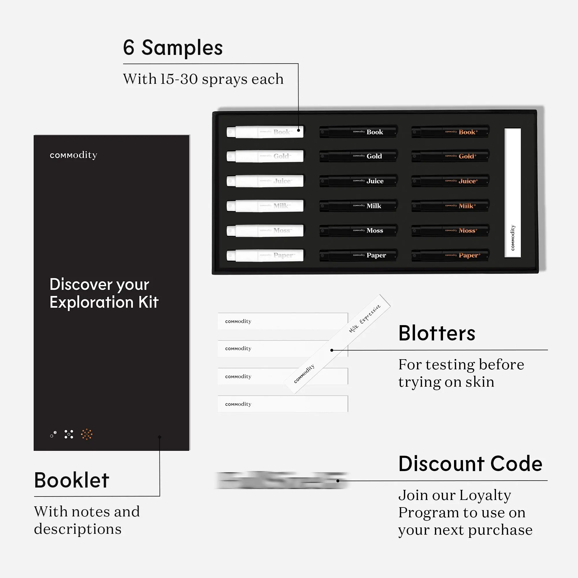 I love the exploration kit. I also have a Milk sense space kit and a Milk Expressive and Bold duo. I fell in love with Milk when I got a sample in an OK Beauty box, but having used the exploration kit I have also fallen in love with Book Bold, which is an entirely different fragrance. I love that the kit comes with a booklet that explains all the different fragrance notes. I am a convert and Commodity will be the only perfumes I buy going forward.