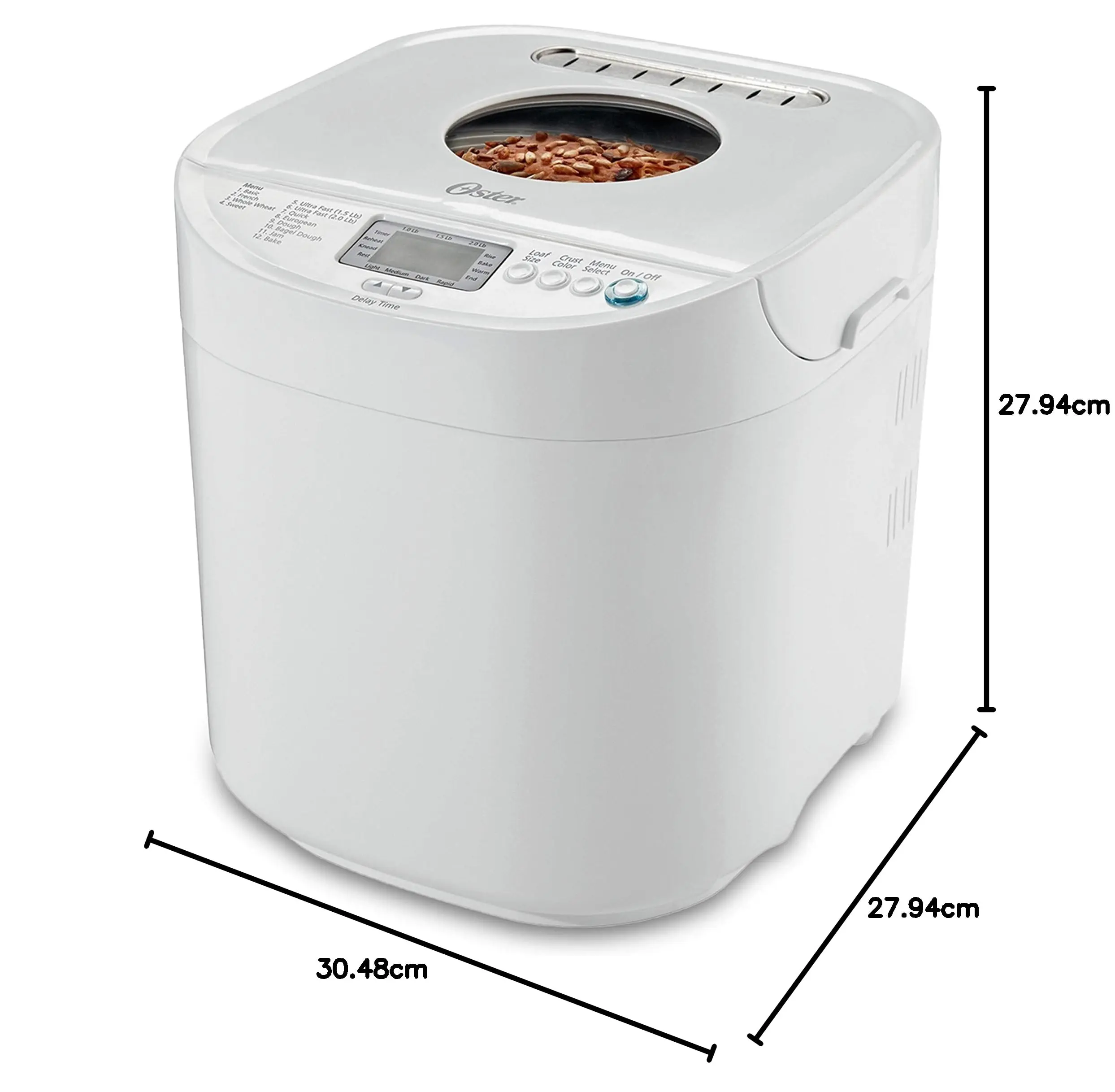 ·Wake up to the aroma of freshly baked bread with the Express bake Bread Machine. Designed to make up to a 2 pound family sized loaf, this bread maker comes with its own tested recipes for ultimate perfection. The bread machine features multiple settings that offer ideal baking versatility and a Delay Bake timer that lets you set the baking time up to 13 hours in advance. An Express Bake cycle bakes delicious bread in under an hour. A large LCD display allows you to easily navigate the settings, and a clear window on the top lets you peek inside to see the bread as it bakes. For added convenience, this bread maker comes with a measuring cup, a spoon, and a kneading paddle. The sleek design with White/Ivory finish effortlessly matches any kitchen décor, making the Express bake Bread Machine a great housewarming or wedding gifeet.