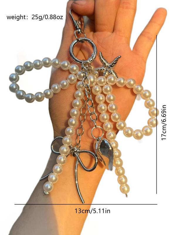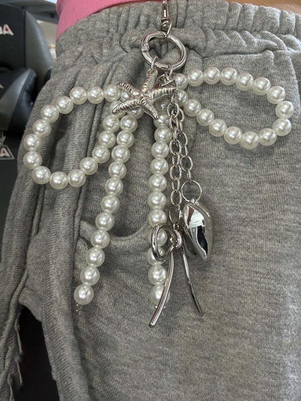 5. Niche design exquisite pearl string keychain, metal bow starfish pendant, sweet and fashionable pearl bow silver heart pendant car keychain pendant versatile bag pendant, shoulder bag crossbody bag small item keychain pendant, Trendy Cute Keychain
