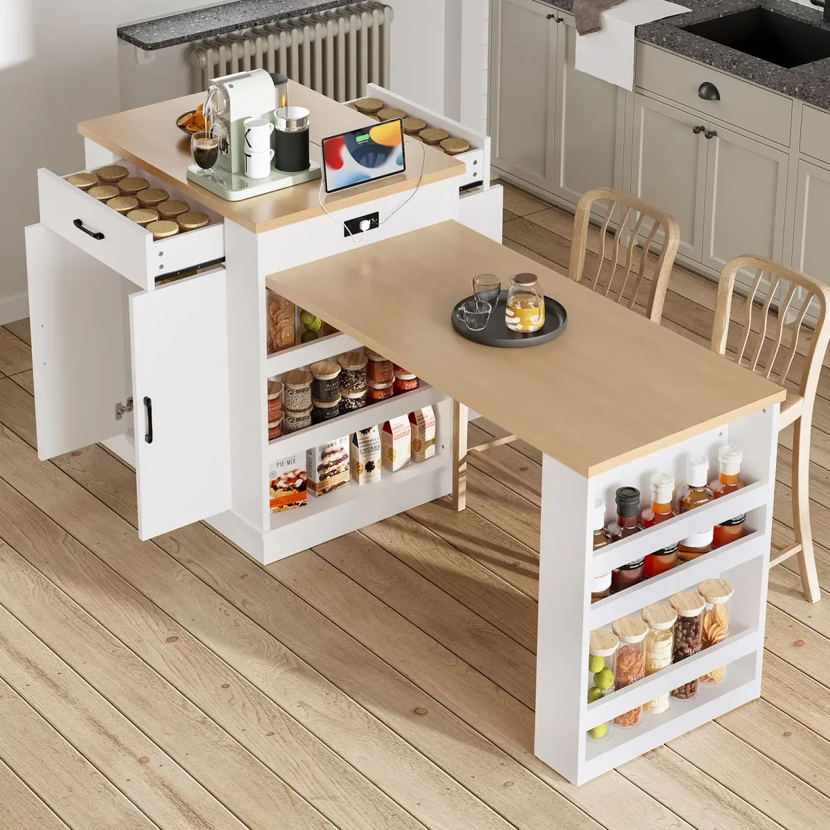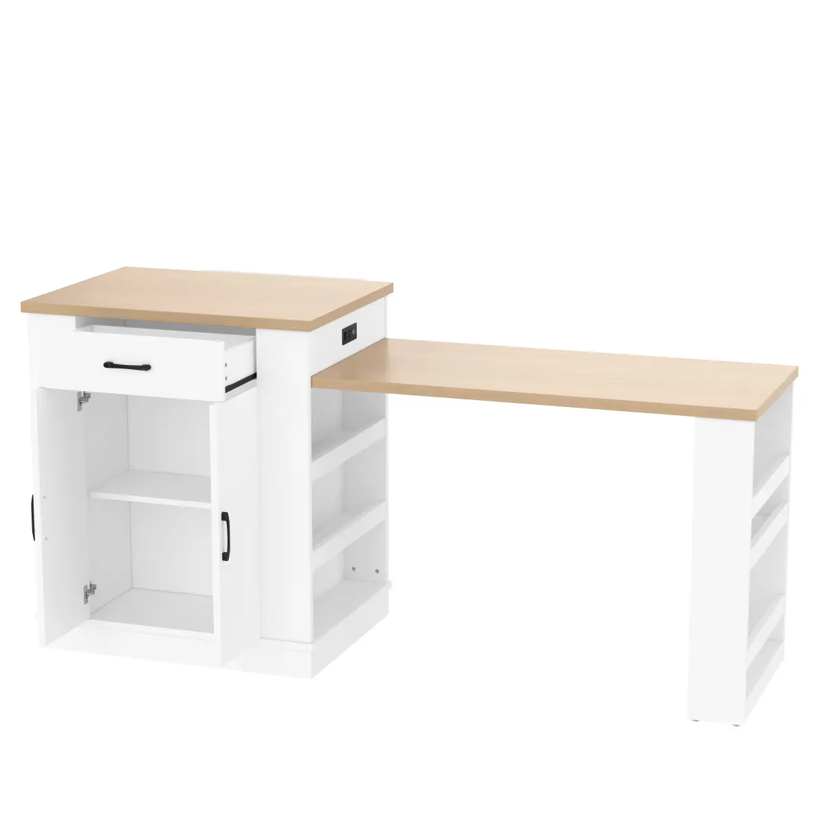 This island serves as both a cooking and prep area and can transform into a compact breakfast bar, an elegant tea table for afternoon gatherings, or even a transitional partition between kitchen and dining room.Its abundant storage features-including drawers, double-door cabinets, and open shelving-offer versatile solutions for diverse lifestyle needs.This organized storage system keeps kitchen essentials clearly categorized and within easy reach.The extended countertop provides additional space for food prep, baking, and other tasks.When multiple people are working simultaneously, it ensures each person has their own dedicated workspace, significantly boosting cooking efficiency.Its sleek, modern aesthetic effortlessly complements various kitchen decor styles while elevating the overall aesthetic appeal.