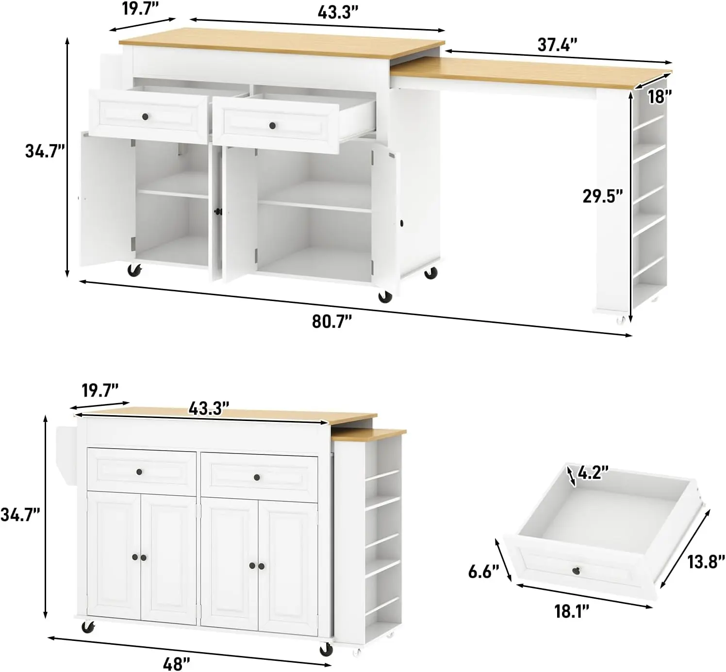 ·80" Sturdy Large Kitchen Island: This Mobile Island Table is made of Sturdy P2 engineered wood and metal,able to withstand the challenges of long-term use.This kitchen cart size:(48"-80.7)"W x 15.7"D x 34.7"H.This portable island for kitchen is designed for ultimate kitchen efficiency.You can easily perform tasks such as cooking, and reasonably take and arrange kitchen utensils and kitchen appliances.Make your kitchen tidy and organized.