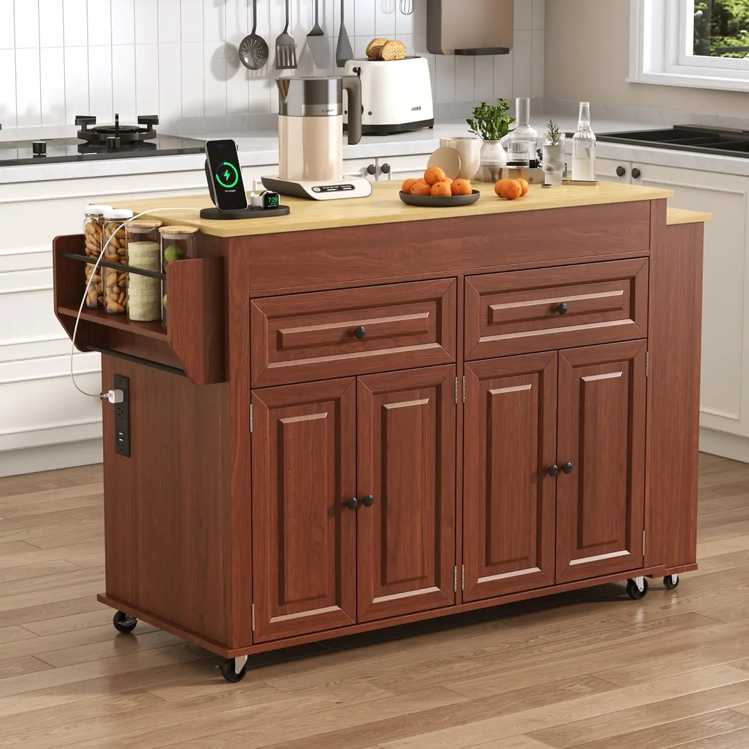 ·Equipped with Charging Socket: For one kitchen furniture, operating kitchen appliances is inevitable.this rolling island cart for kitchen with a convenient power outlet and USB port.so you can directly charge kitchen supplies or other electronic devices, such as the juicer and oven and microwave in the kitchen, the coffee machine and bread machine in the restaurant.enhancing the practicality of the Storage Cabinet.
