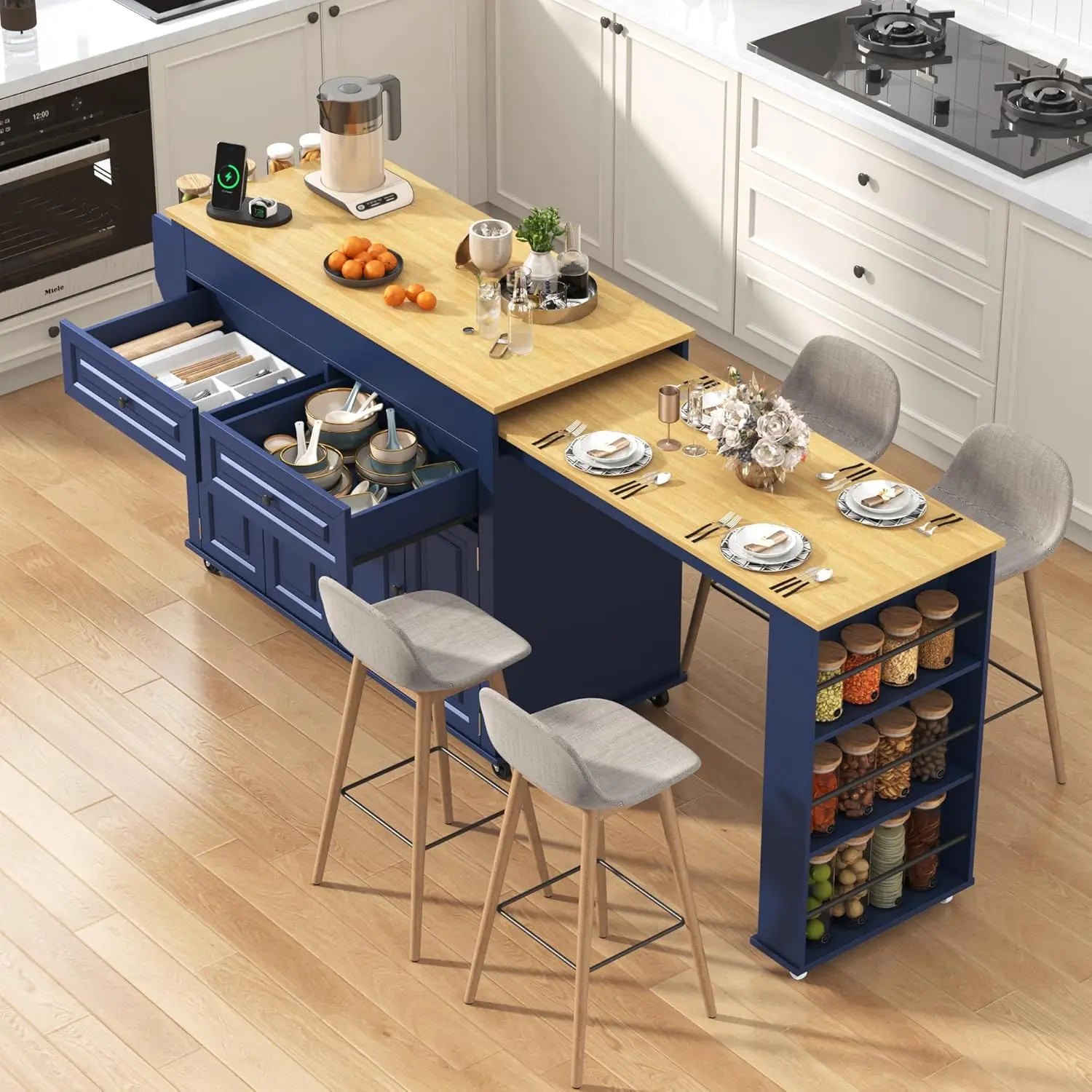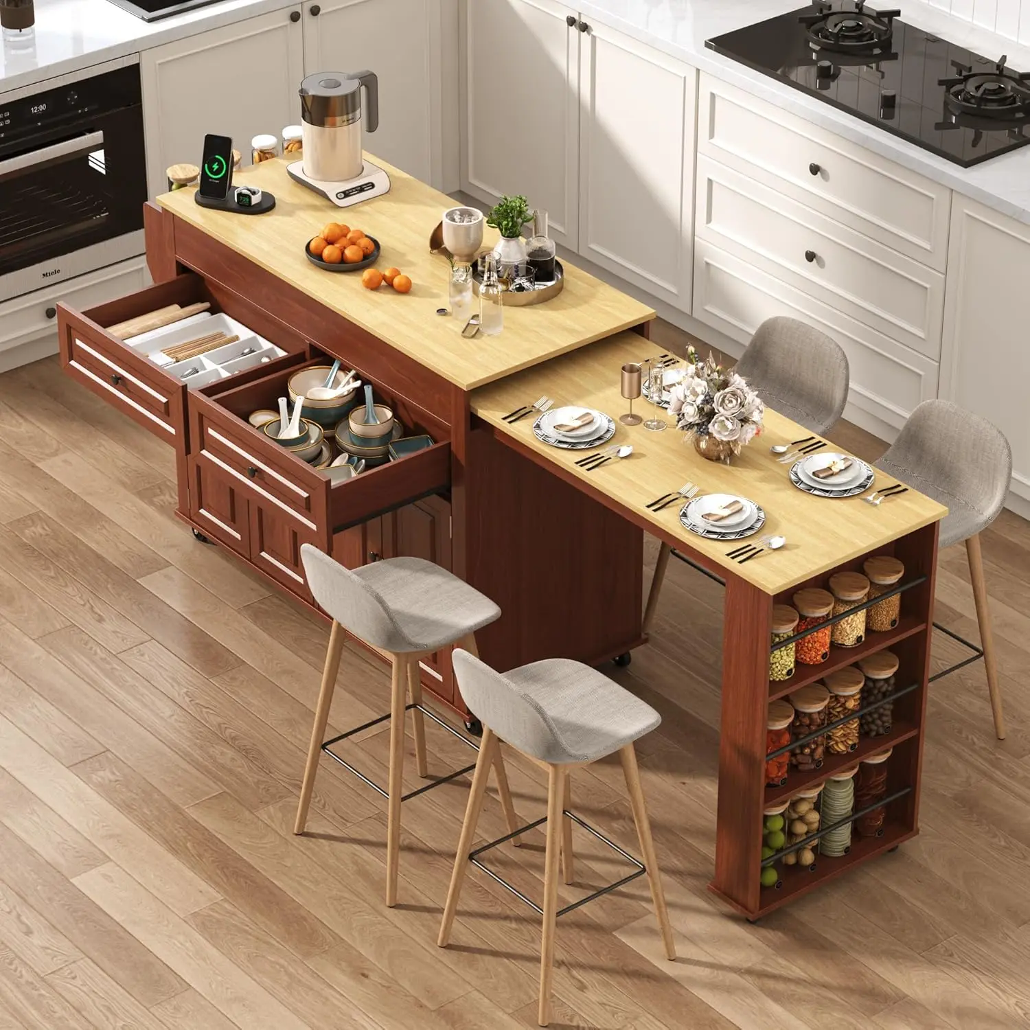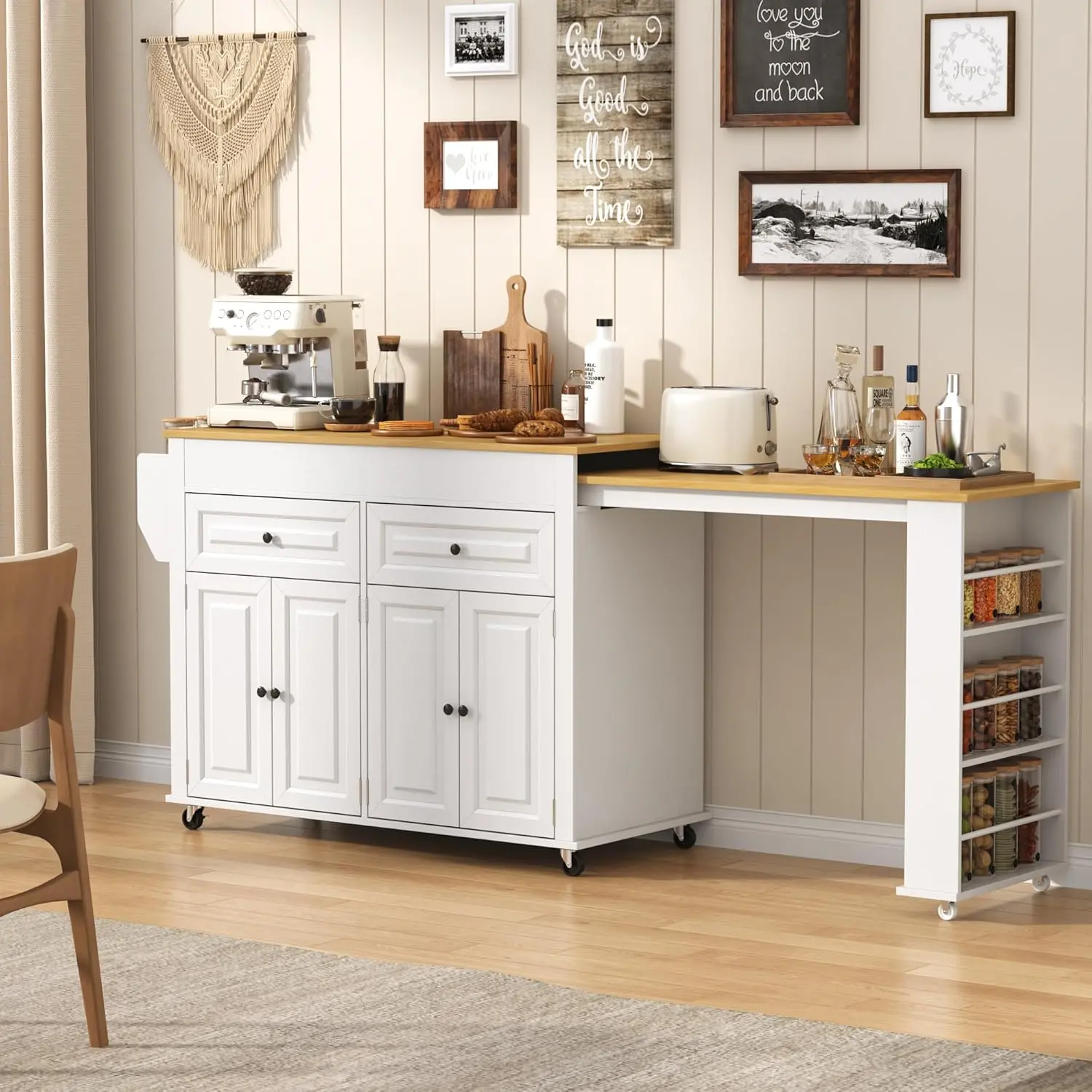 ·Ample Storage Space: First of all the extended dining table is able to optimize the use of available space effectively. Secondly, the kitchen island is equipped with four-door cabinets and two large storage drawers,Can hold tableware and large appliances, so you don't have to worry about running out of space. The 3 rows of additional storage racks under the side retractable tabletop and the shelves in the cabinet allow for a wide variety of using space and the ability to place different items according to your needs.