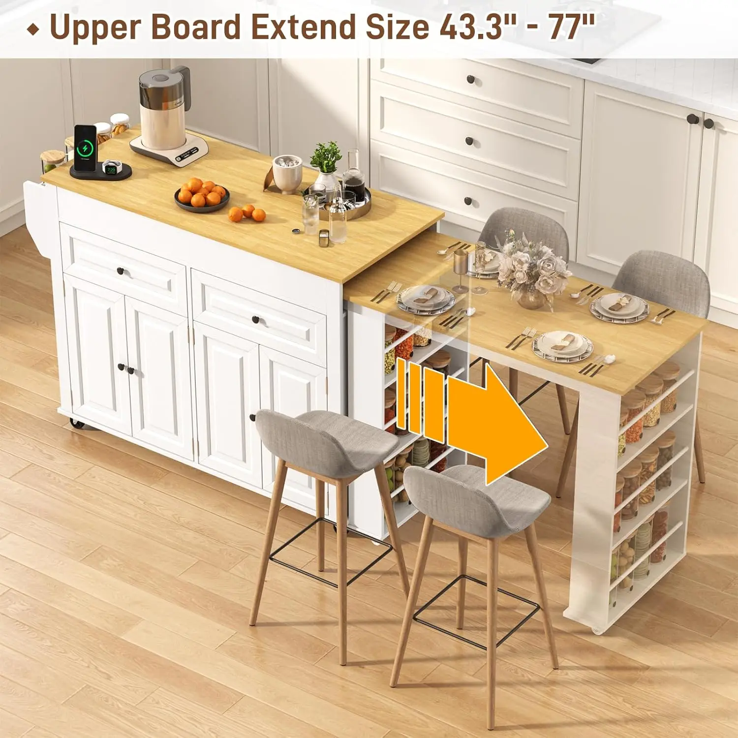 ·Extendable Kitchen Island: In order to maximize the use of the kitchen island cart, we designed a extendable dining table. The extendable size of this kitchen island is 80"-48". It can be used as an ordinary kitchen island for preparing food, or It can also be fully expanded into a dining table for multiple people. and it can also be used as a dining table for parties.This is our unique and convenient design.