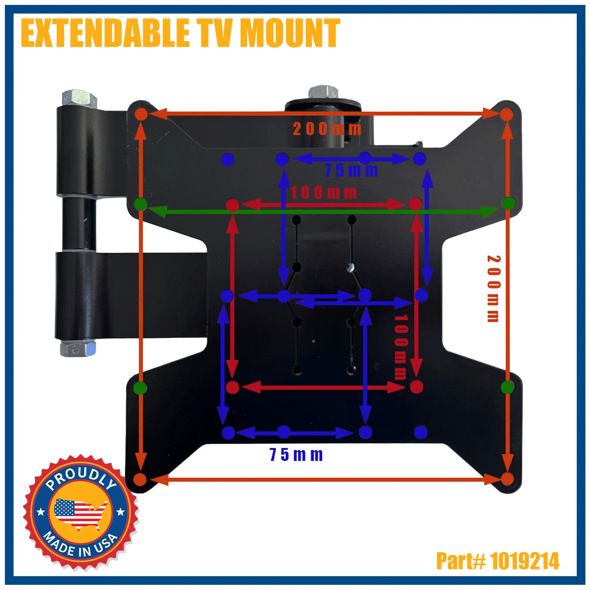 Please keep in mind that the 75mm VESA pattern on this extendable mount will be off-center. As you can tell from the graphic it can be mounted on the left or right with the 75mm VESA Pattern, also it can be on the bottom or top of the mount. The 100mm x 100mm, 100mm x 200mm, 200mm x 200mm will all be centered on the extendable mount.