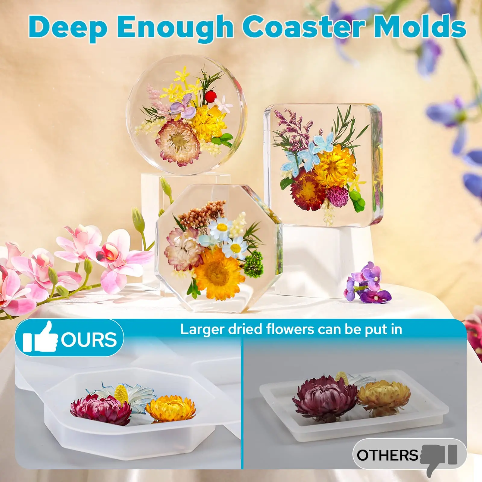·【Versatile Uses】Beyond making resin coasters, this silicone molds can also create dried flower preservation ornaments, and wall decorations (perfect for wedding or home scenes). It even works for encapsulating insect specimens or precious mementos. Feel free to add dried flowers, dyes, glitter, stickers, or other elements to customize your pieces. The finished coasters are suitable for coffee cups, wine glasses, mugs, beer bottles, potted plants, jars, and more—easily DIY home decorations or artworks of different styles