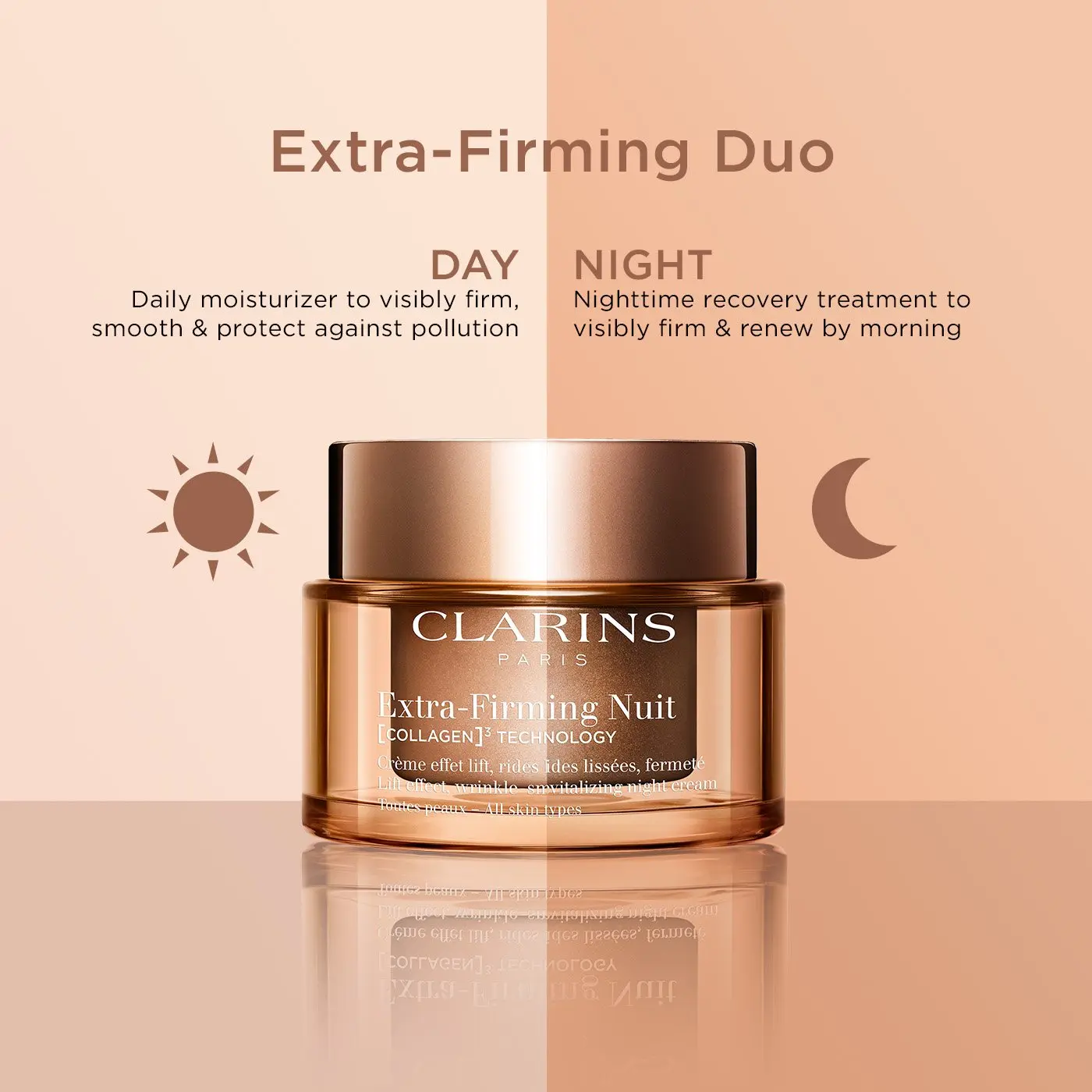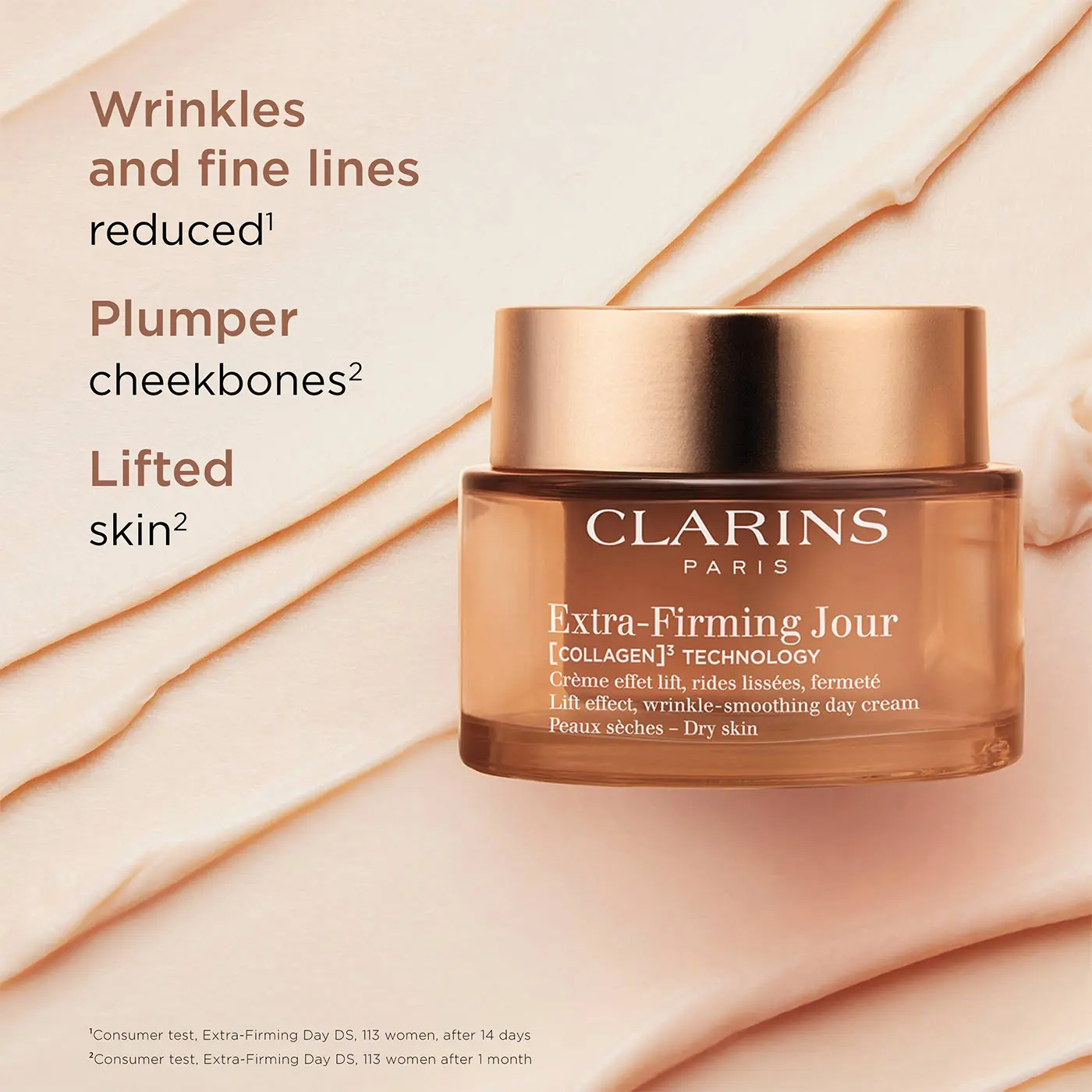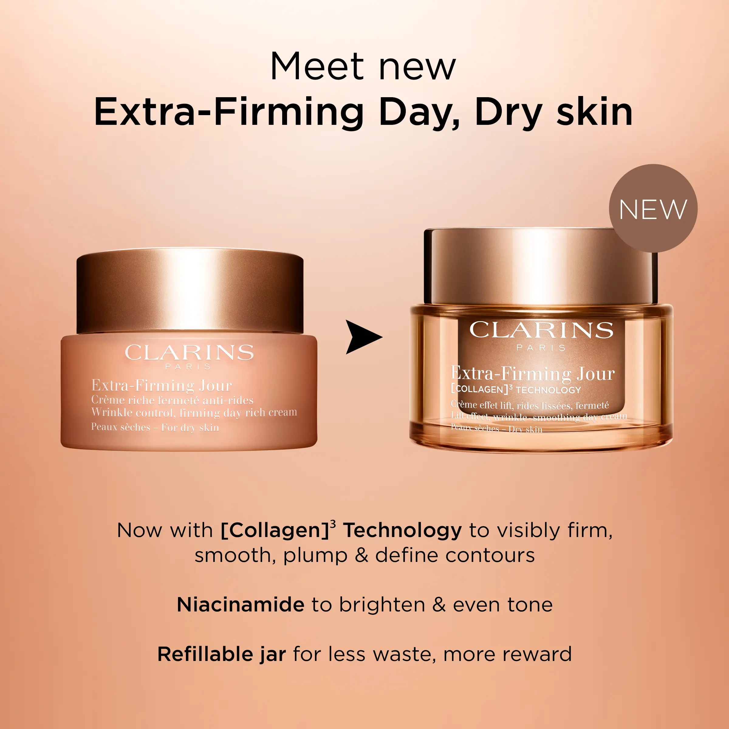 Extra-Firming Day Dry Skin, a high-performance, anti-aging daily moisturizer for dry skin that harnesses the latest advancements in nature and science to target the three key markers of skin firmness: smoothing wrinkles, plumping skin, and redefining facial contours. Skin is visibly firmer in 7 days.¹