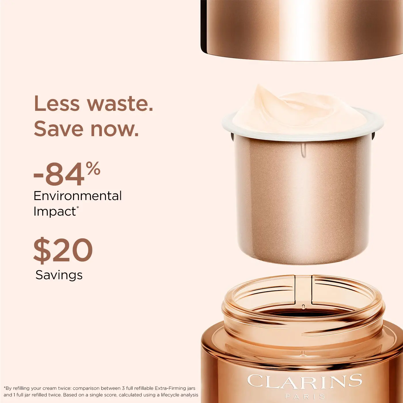 ²By refilling your cream twice: comparison between 3 full refillable Extra-Firming jars and 1 full jar refilled twice. Based on a single score, calculated using a lifecycle analysis