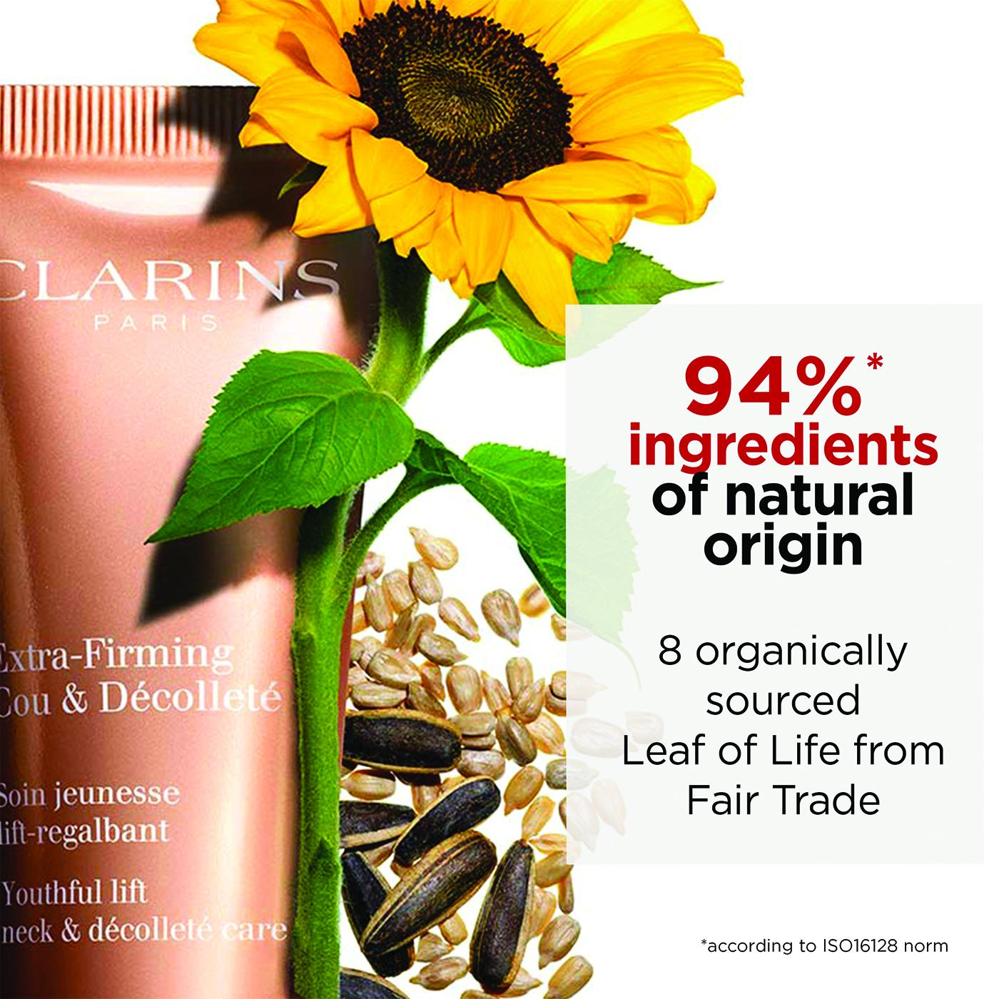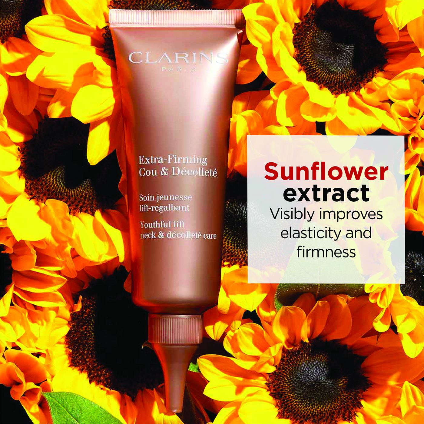 Inspired by the movement of the Sunflower's stem, Clarins Laboratories combined Sunflower extracts - unsaponifiables obtained from the seed + auxins obtained from the stem - to improve the elasticity and firmness of the flexible neck and décolleté area, boosting the skin's resistance to daily bending and rotating while protecting against harmful indoor and outdoor pollutants.