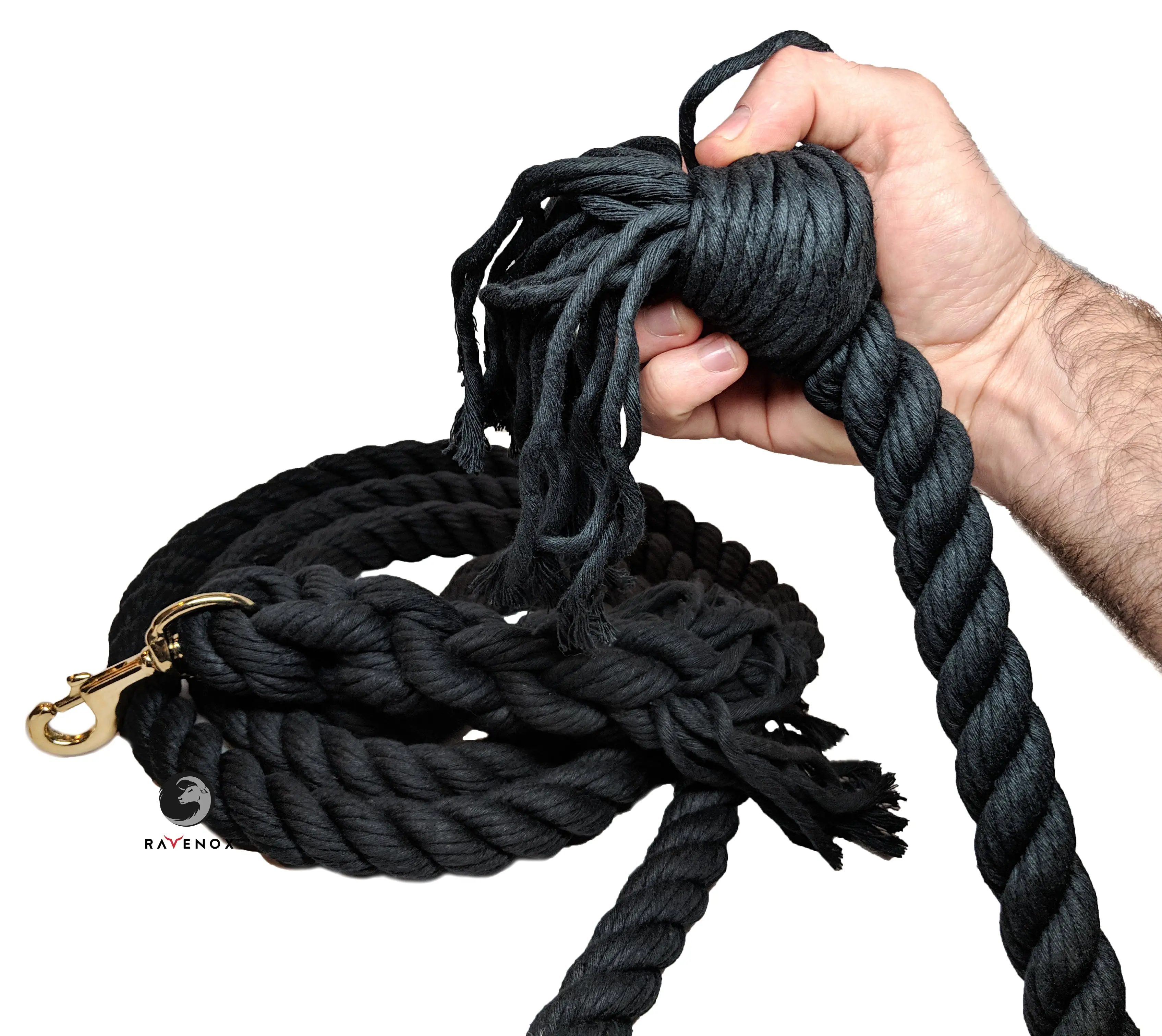Horse leads are used to lead and tie horses. Leads are often used in conjunction with horse halters and the Ravenox triple twisted cotton rope horse lead is available in 1-Inch in diameter and measures 8 feet long. We make our leads with rope made in America on American machines and hand-assemble our horse leads here in America. They contain no harmful chemicals or dyes. The natural cotton rope horse lead is very soft on your hands and provides for a strong grip. Whether you're on the trail, at the corral, or on your ranch you can lead your horse with confidence knowing you have the strongest lead available. Cotton rope horse leads are ideal for outdoor use situations involving exposure to direct sunlight for extended periods of time, as they are not susceptible to UV damage like synthetic ropes are. You can lead a horse to water and make sure your lead line never fades.