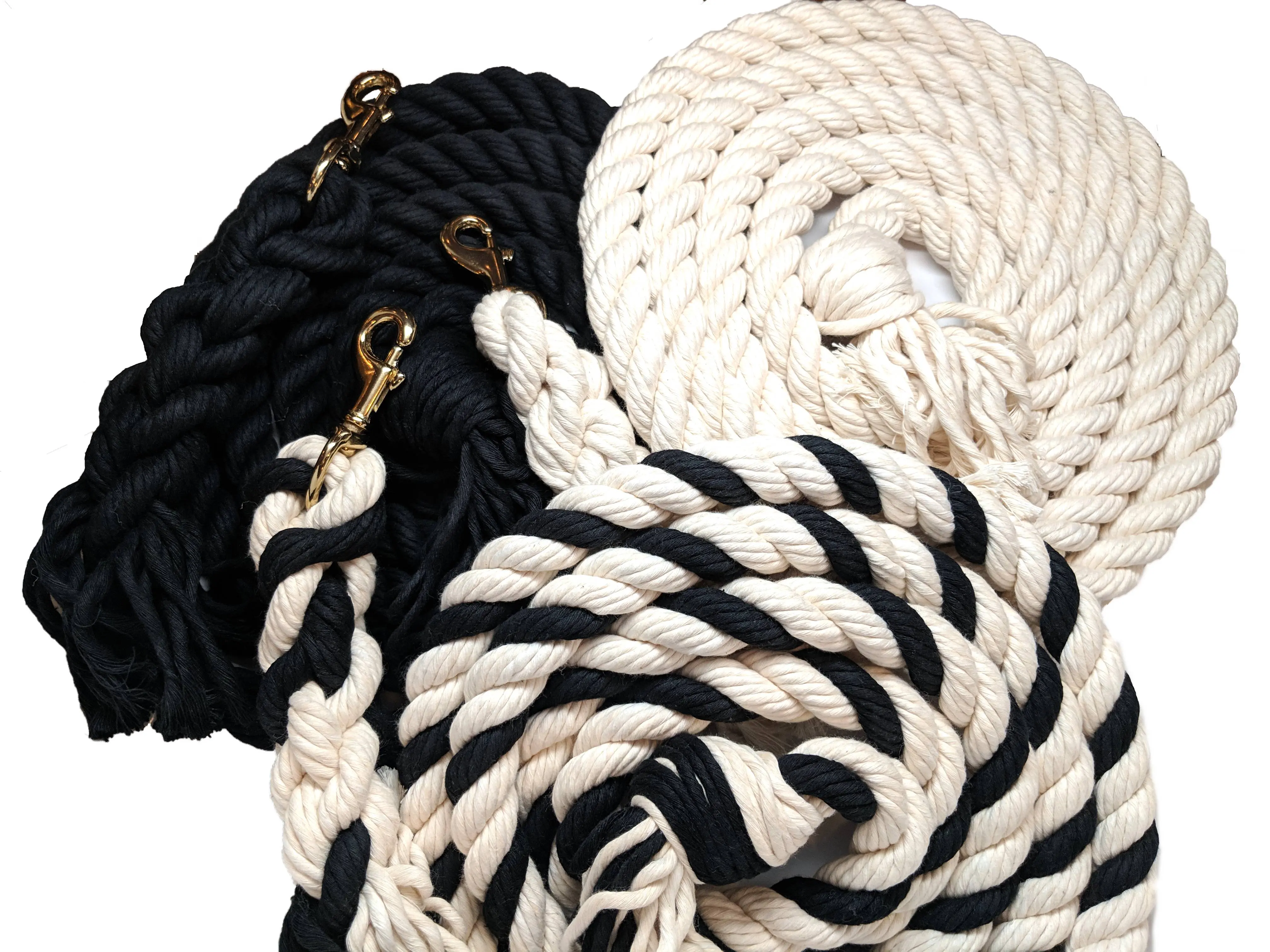 🐴 Cotton Lead Rope for Horses: Our twisted cotton rope used in our horse leads is strong and durable. Available in a 1-inch diameter x 8-feet long in a choice of Black, Natural White & Black, or 100% Cotton Natural White. The heavy-duty metal snaps are secured by hand braiding the rope back on itself. The leading end of the rope is also hand-braided to provide a stronger grip. Customization of our horse leads is available on bulk orders.