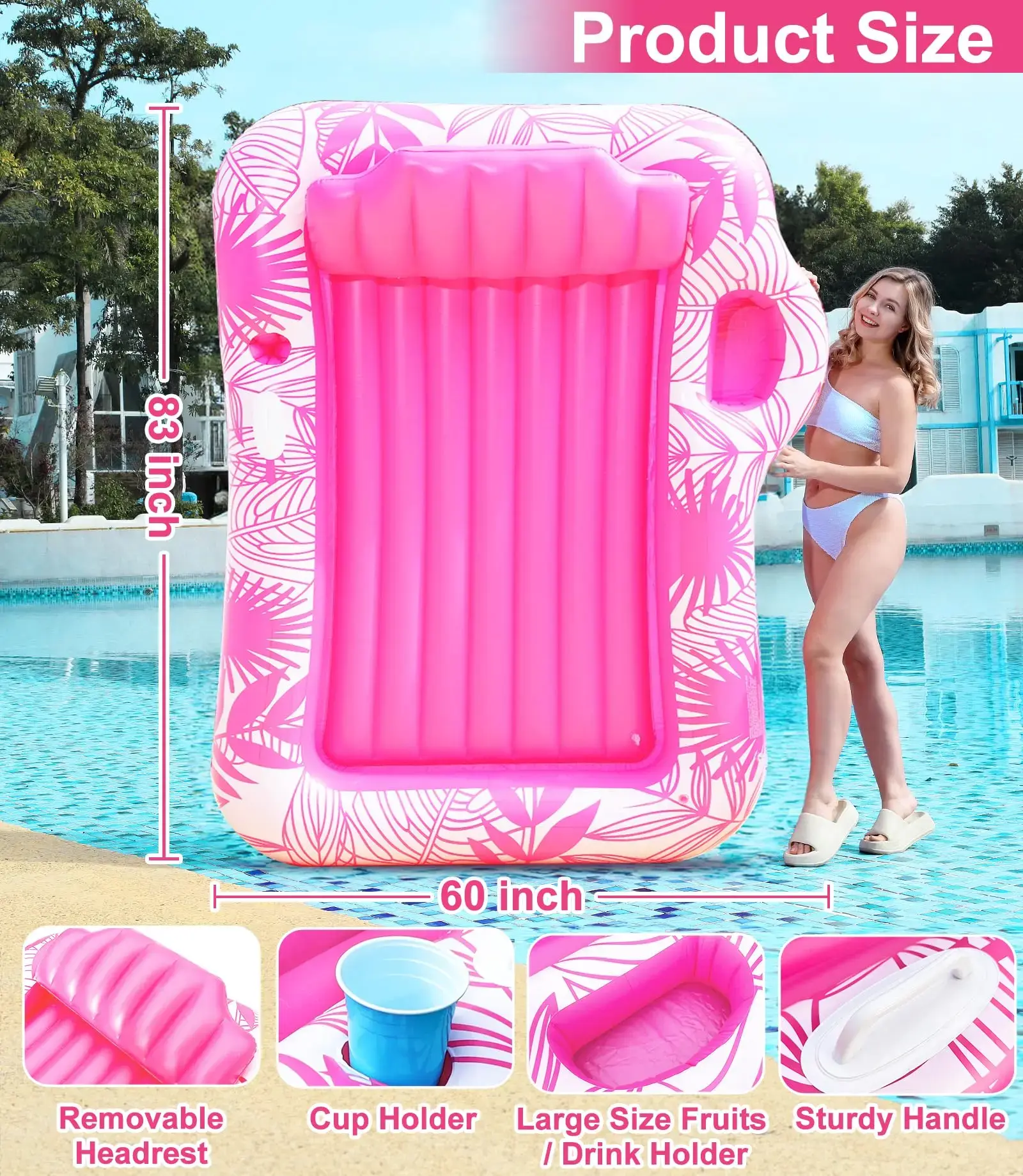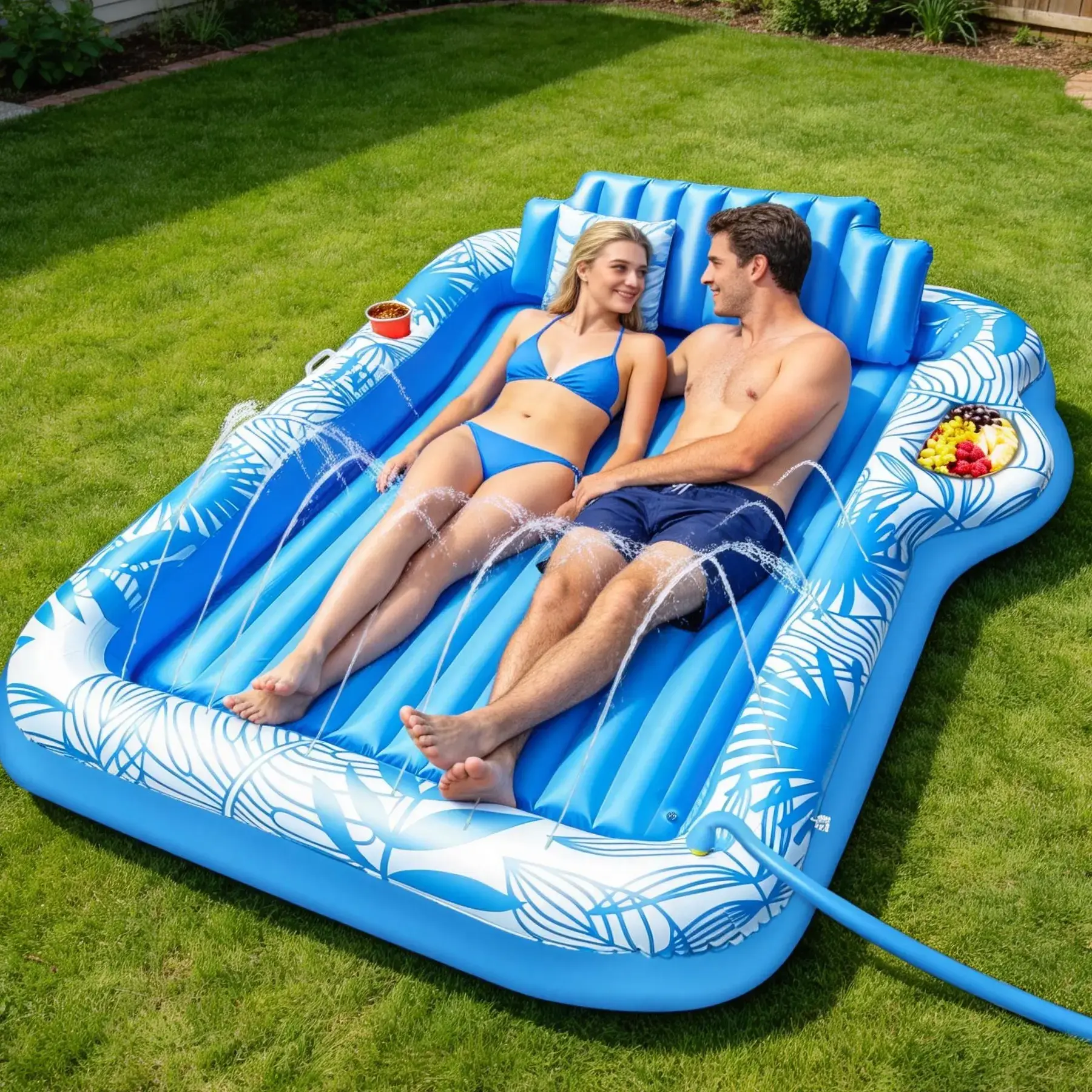 Extra Large Inflatable Tanning Pool Float Lounger Inflatable Tanning Pool Lounger is measured 83" x 60" x 7.8" (L x W x H), spacious for two to sunbathe together—unwind in the sunshine with family, friends, or loved one (up to 440 pounds). Features a vibrant tropical plant design, brightening your outdoor space and creating a tropical getaway feel. Semi-Circular Sprinkler Design The inflatable tanning pool float is built-in water spray holes, with semi-circular layout and adjustable spray height, creating a customizable, cooling water mist around you under the summer sun. Just fill the tanning lounger with water to turn it into a tanning pool, perfect for lounging and soaking up the sun. Comfortable and Portable This tanning float offers high comfort and safety. Designed with a cup holders, a food holder, a detachable backrest, and a ribbed air cushion base providing comfort support for neck and back. Inflatable design and side handles make it portable, instantly transform outdoor space into a relaxing summer retreat. Durable Material Made from 0.23 mm thick PVC material, this tanning pool lounger is tear-resistant and built to last. Sprinkler pool is easy to inflate and deflate, featuring two double-lock inflation ports to prevent leaks, delivering comfort and cooling summer after summer. Versatile Summer Pool Party Float Perfect for tanning, sunbathing, ball pit, and relaxing all summer long, this inflatable tanning pool float is ideal for backyards, lawns, beaches, lakes, garden pools, and pool parties. Enjoy a refreshing summer lounging experience with this inflatable sofa pool.