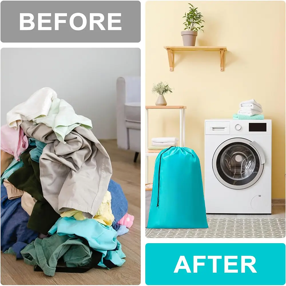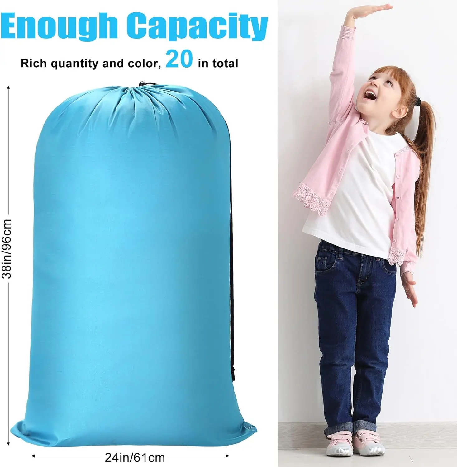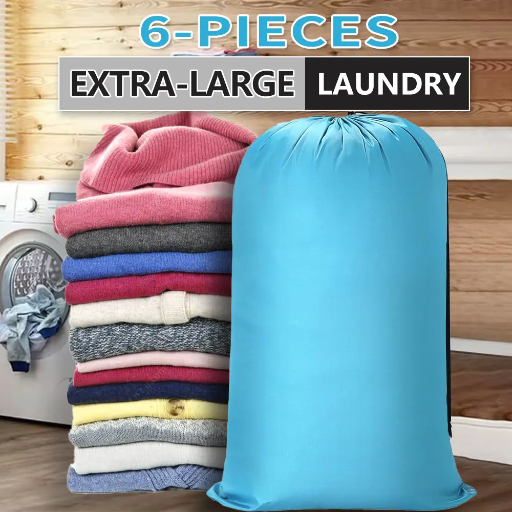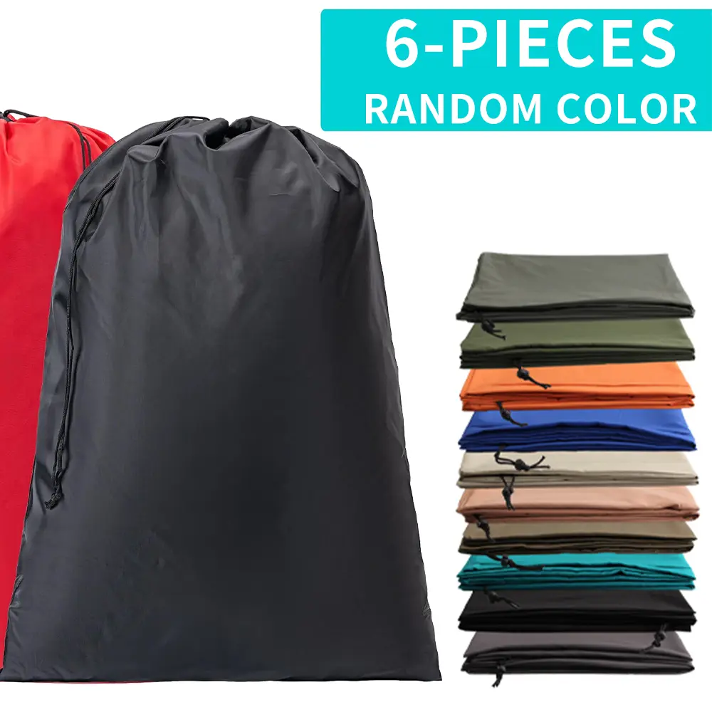 This set includes six extra-large laundry bags, ideal for home or travel storage. Each bag measures 24" x 39", providing ample space for clothes. The durable drawstring closure ensures secure packing. These washable, portable, folding, and collapsible bags are perfect for organization. They fit easily into a laundry hamper or basket. Essential for travel, these bags are a must-have for any trip.