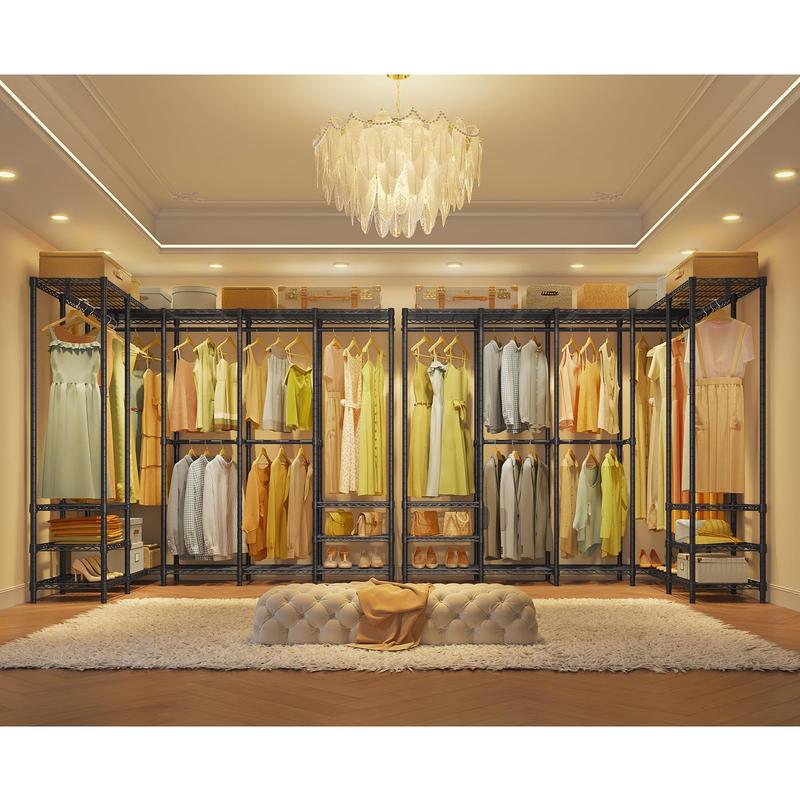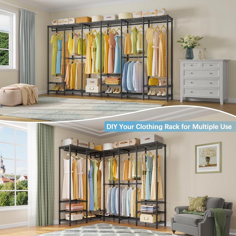 This versatile closet rack (112.4"L x 15.7"W x 76.4"H) supports up to 1620 lbs and features adjustable shelves and 5 hanging rods for customizable storage. Made of durable carbon steel, it's easy to assemble and perfect for any space.