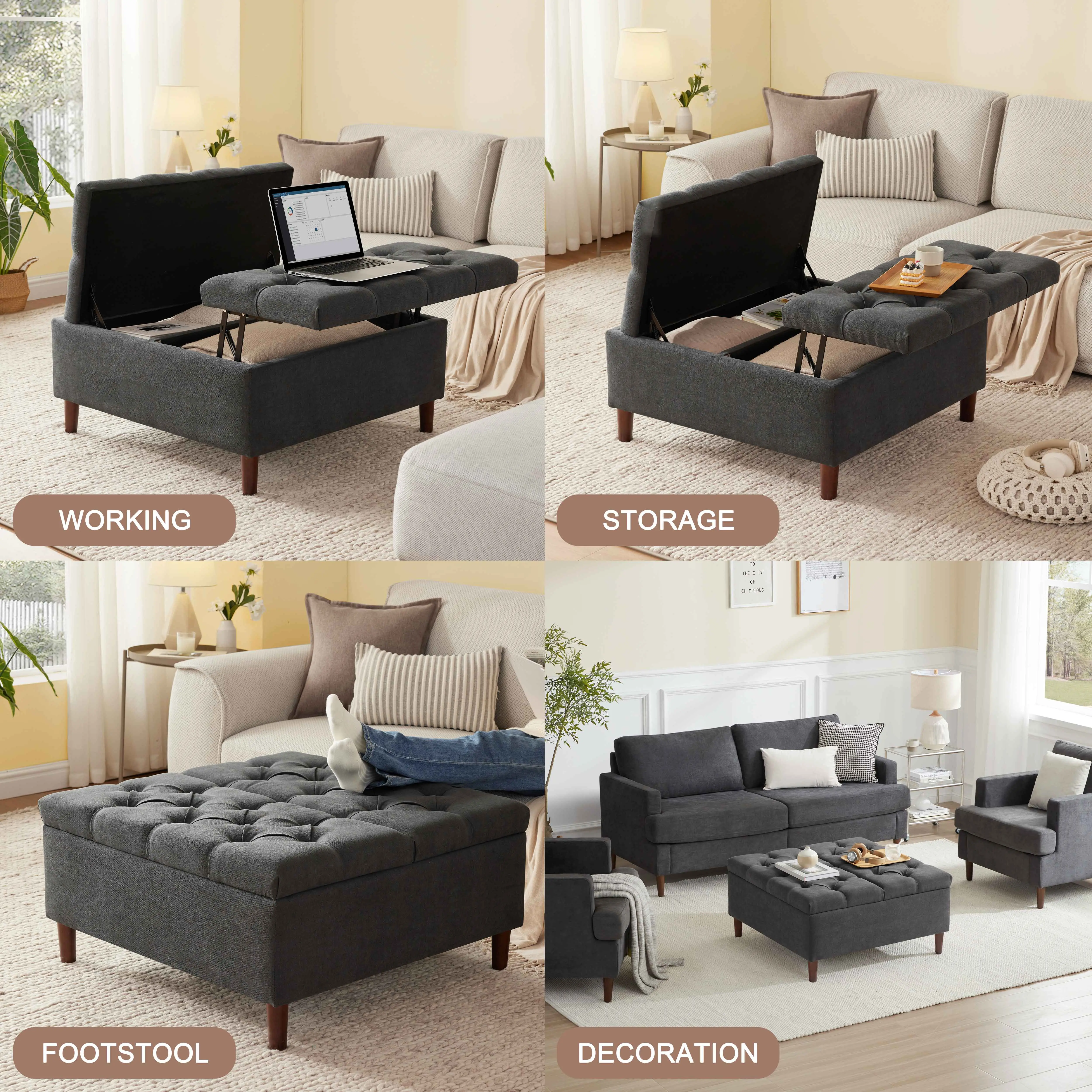 ·MULTIFUNCTIONAL: Our extra large ottoman with storage for living room not only can serve as a decorative element in your room but can also function as a storage box, a workspace, a coffee table for gatherings, and a comfortable footrest
