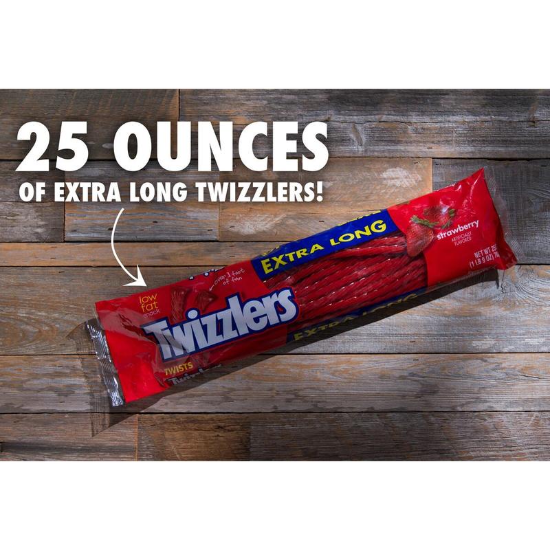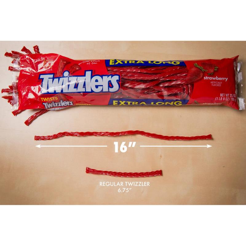 Enjoy delicious Twizzlers in a new, super-long length! At over two-and-a-half times the span (but same thickness) of a regular Twizzlers, Extra Long Twizzlers boast an impressive 16-inch length.