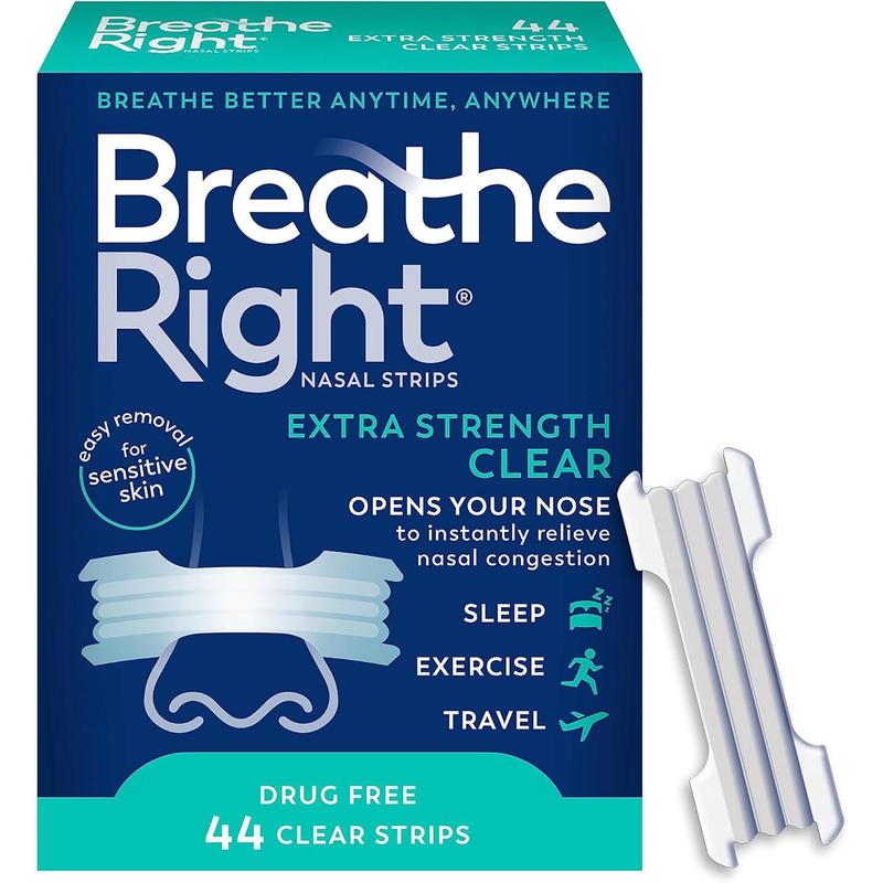 Breathe Right Extra Strength Nasal Strips work to instantly open your nose for nasal congestion relief you can feel right away. Breathe Right nasal strips alleviate your nasal congestion, whether from colds, allergies, or a deviated septum, by widening your nostrils, helping you take air in more easily. Each Breathe Right nasal strip is uniquely engineered with flexible "spring-like" bands and sticks to the area right above the flare of each nostril. As the bands attempt to straighten back to their original shape, they gently lift open the sides of the nose - instantly opening your nose for immediate relief. Our Extra Strength nasal strips are 50% stronger than our Original nasal strips and feature a hypoallergenic material specially made for those with sensitive skin. The strips are flexible, non-porous, and clear almost unnoticeable to the eye. Additionally, the Extra Strength Clear nasal strips can be used anytime, anywhere: as your go-to snoring strips, offering snoring relief, or being great for use during exercise, allowing for better breathing while working out or playing sports. Breathe Right is safe for adults and children over the age of 5. Breathe Right nasal strips may be used on a daily basis. Do not use for more than 12 hours per day. If rash or skin irritation occurs, discontinue use. Each strip is for single use only - do not reapply; use a fresh strip. Each nasal strip is individually sealed in its own wrapper for ease of use. Caution: Packaging of the product contains natural rubber latex which may cause allergic reactions.