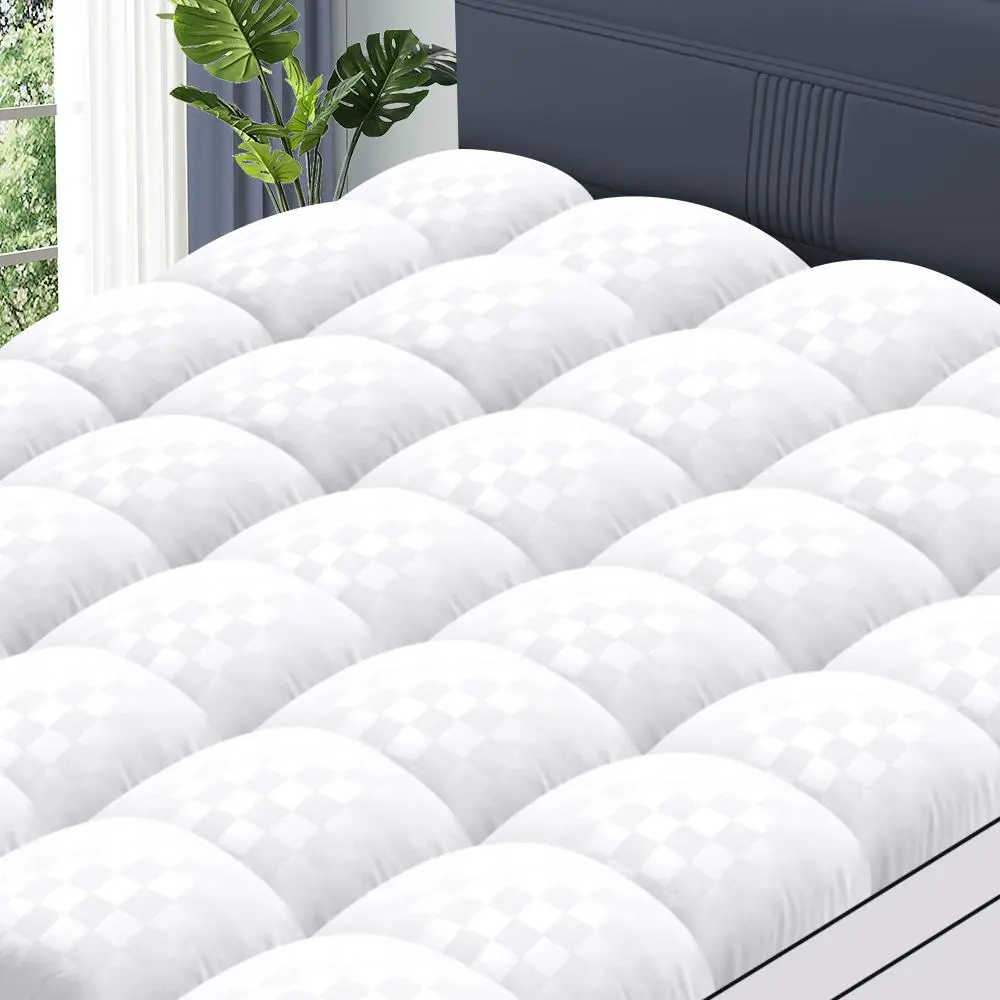 Premium Surface Material - The mattress topper adopted microfiber fabric made, which is breathable and skin-friendly, providing you superior softness and comfort. The surface features square jacquard design, both beautiful and unique. And the mattress pad is made of 400TC combed fiber, is durable, less likely to tear even with frequent washing
