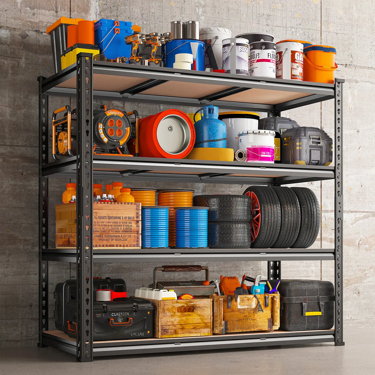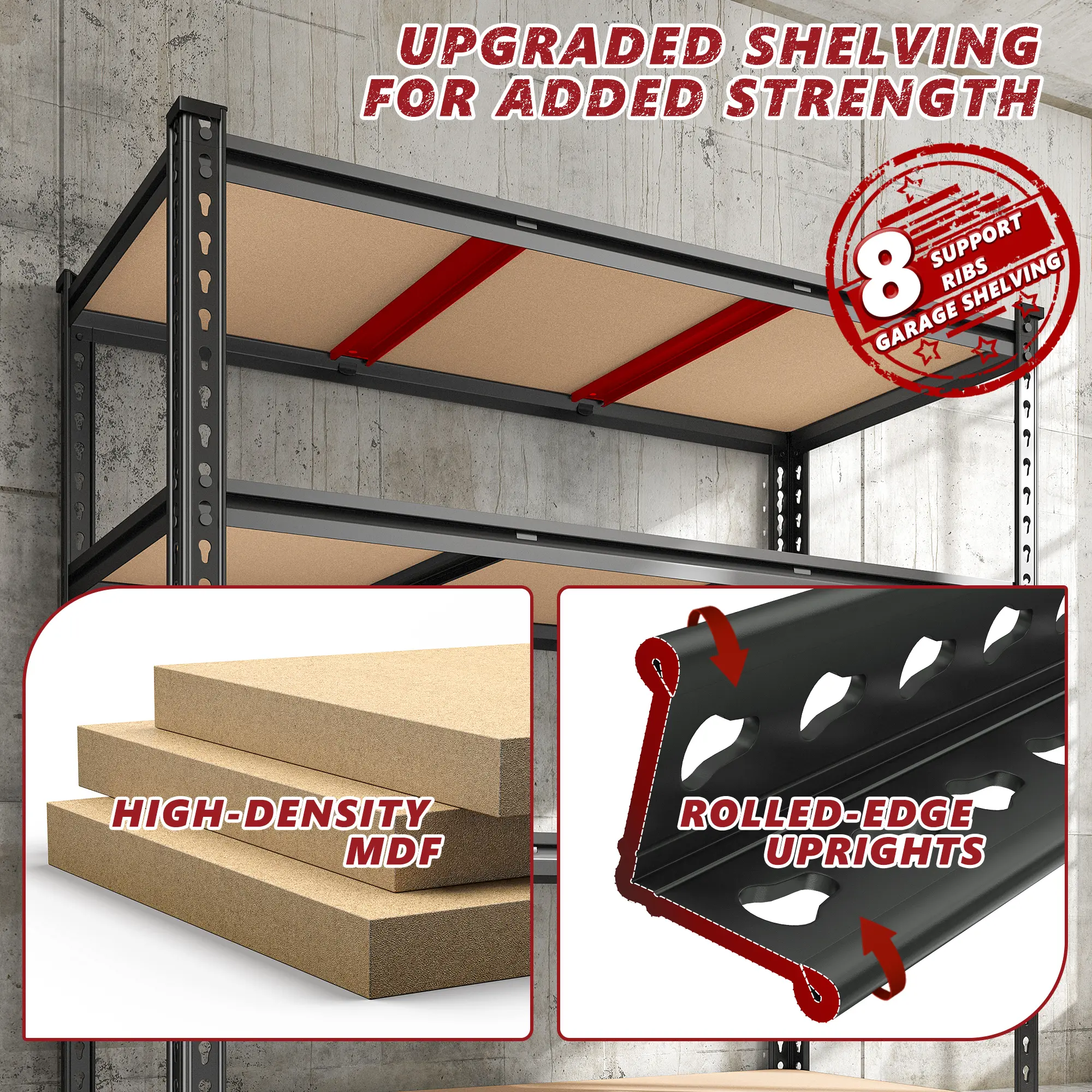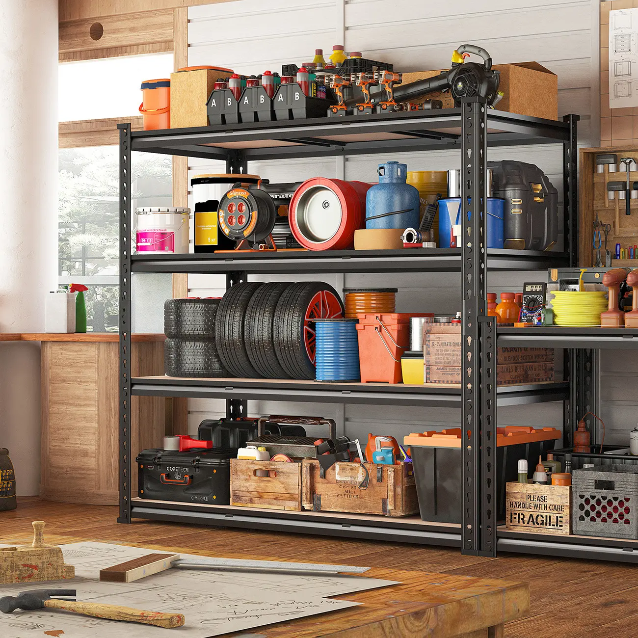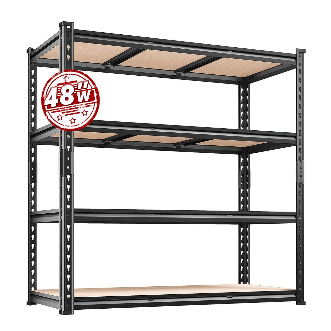 Raybee Extra-Wide Garage Shelves boast rolled edge thickened columns and 2 reinforcing ribs per shelf. Made from high-quality metal and 5mm high-density MDF boards, these shelves can hold up to 500 lb, totaling 2000 lb for the 4-tier unit. Ensuring stability and ample storage, these shelves are a reliable choice for your home or even business needs.